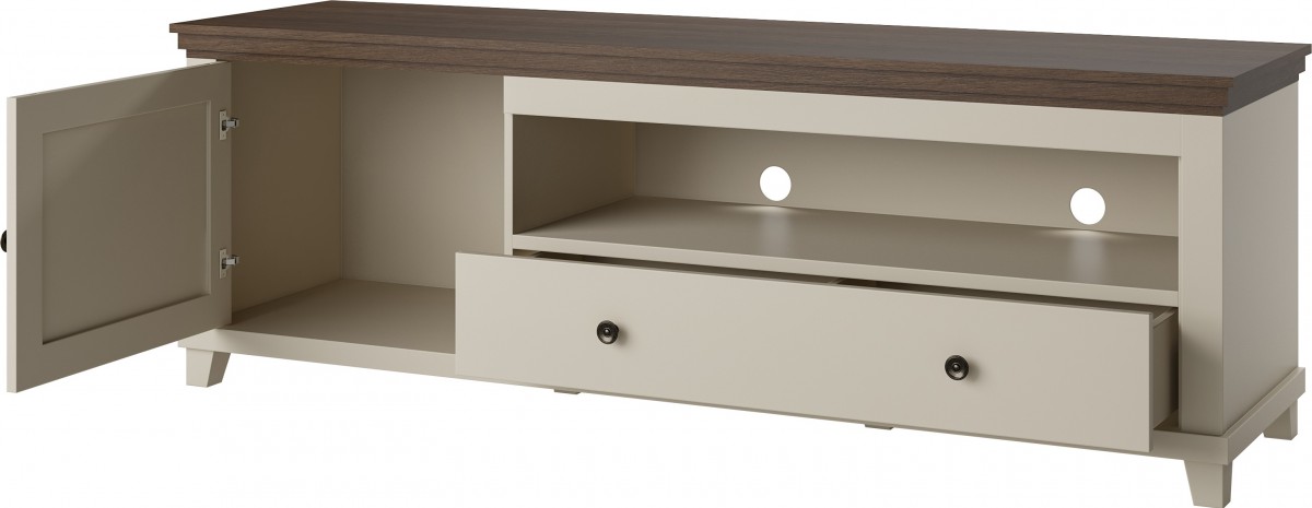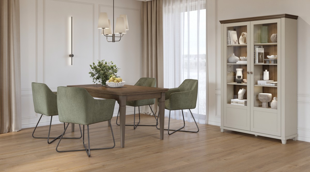 Kolekcja EVORA idealnie wkomponuje się w klasyczne wnętrze. Połączenie ciemnego koloru z tradycyjnym jasnym drewnem to propozycja dla miłośników elegancji. Seria doskonale sprawdzi się w pokoju dziennym, w salonie oraz w jadalni. Do Państwa dyspozycji są komody, witryny i wisząca półka. Uzupełnieniem kolekcji jest stolik kawowy i stół rozkładany. Meble dostępne są w kolorze zielonym w połączeniu z Dębem Ribbec. Atutem kolekcji jest możliwość zamontowania dodatkowego oświetlenia LED.