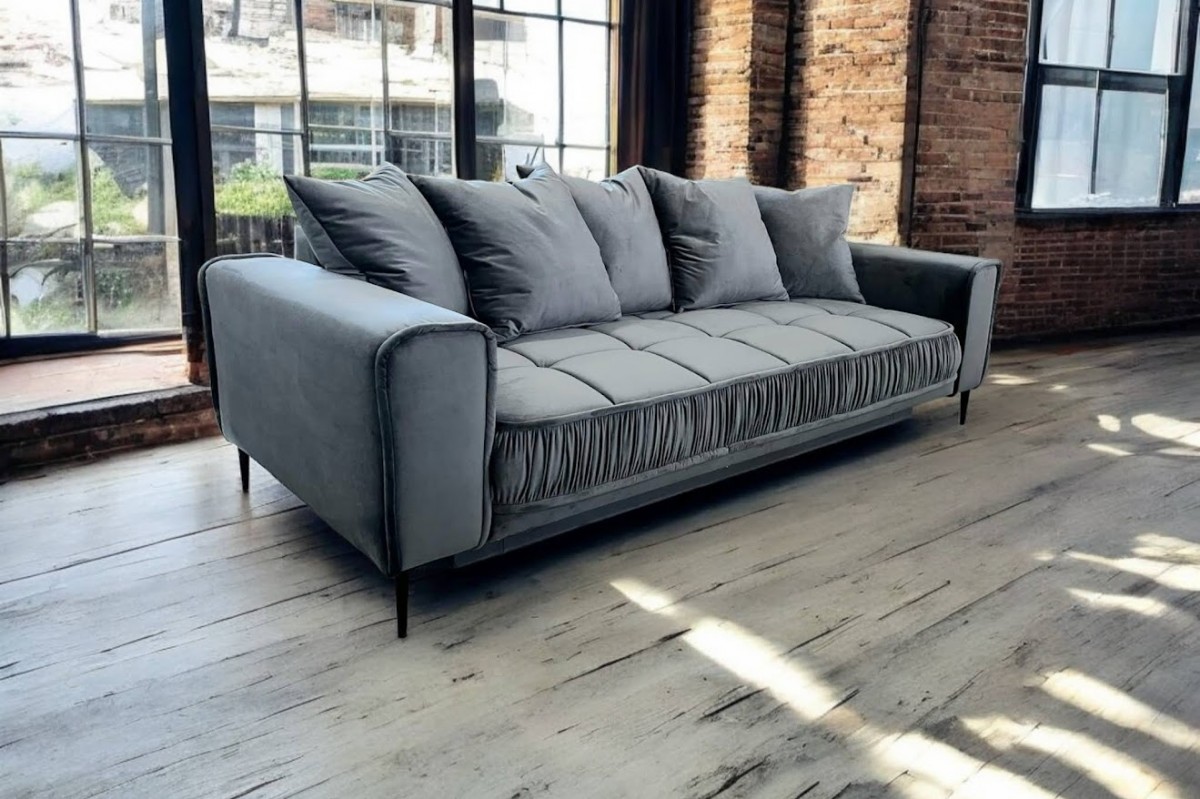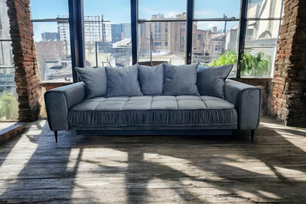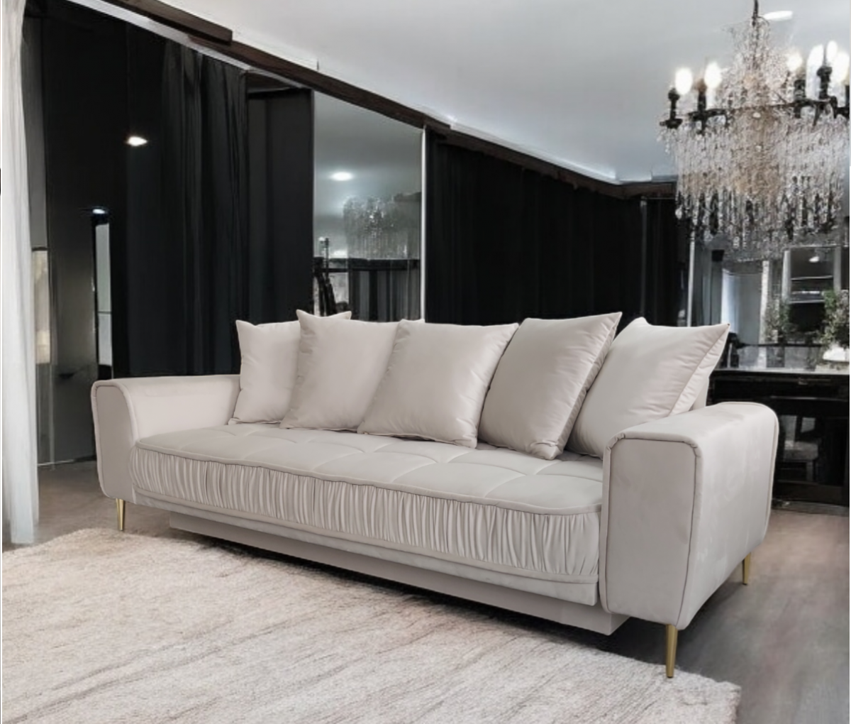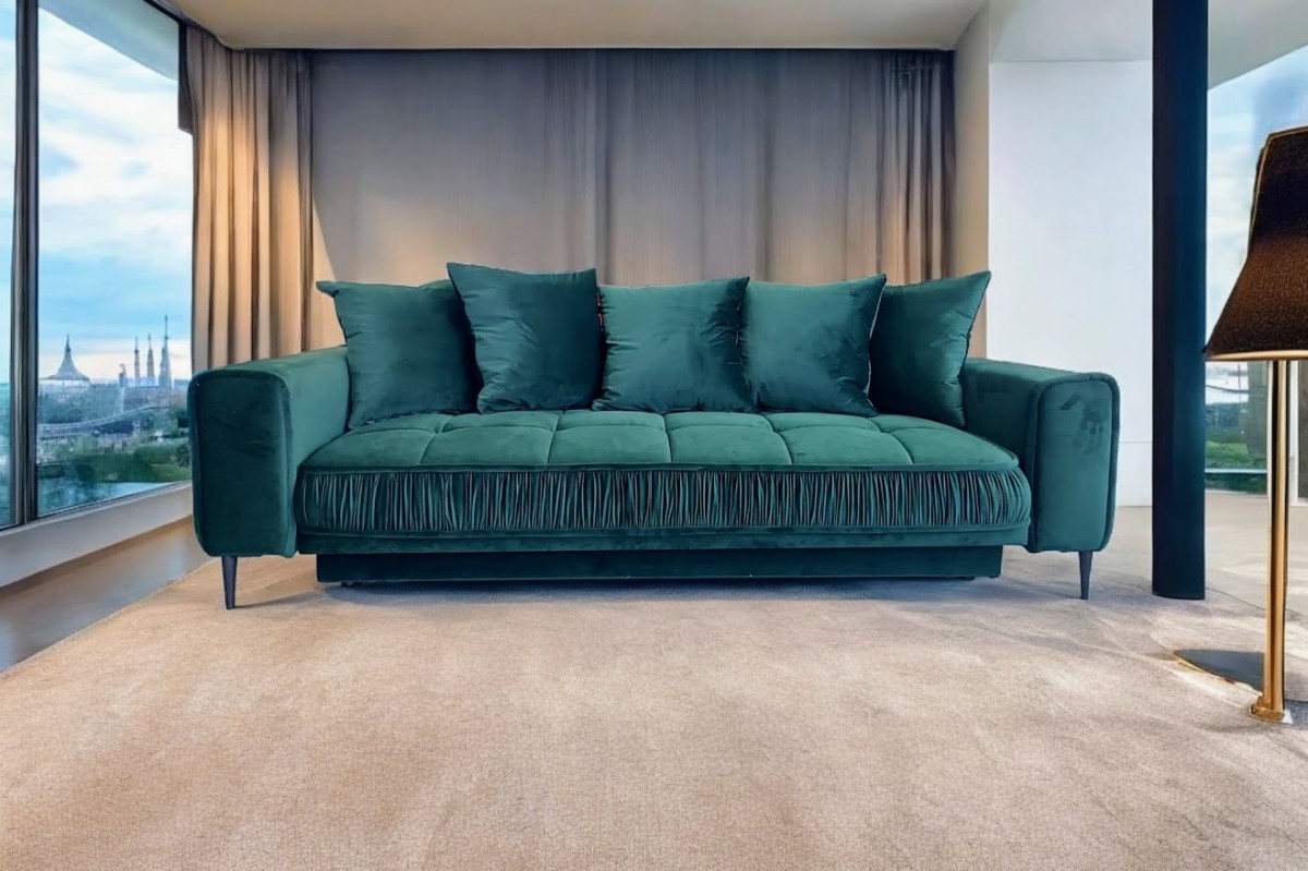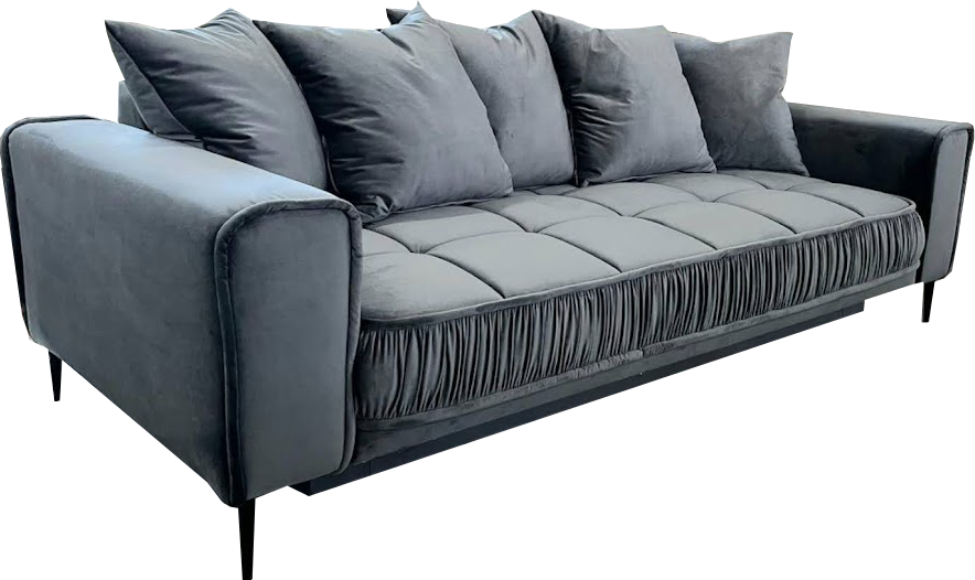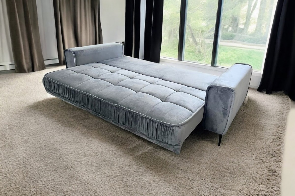 Siedzisko odkładamy do przodu (pod siedziskiem pojemnik) > oparcie kładziemy > gotowe, sofa rozłożona do spania.