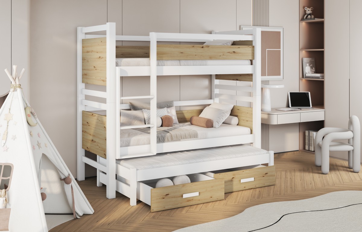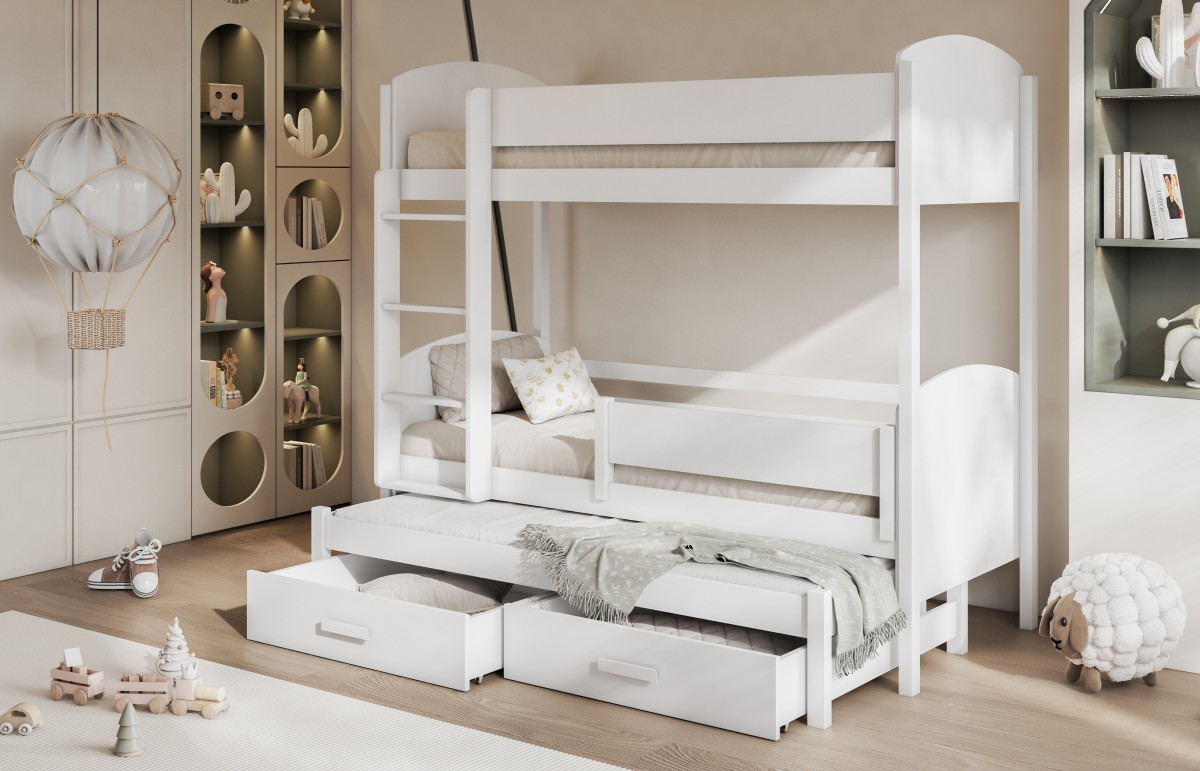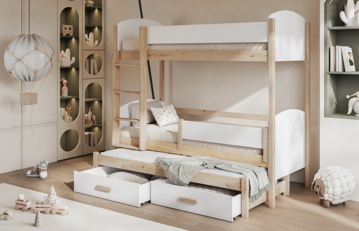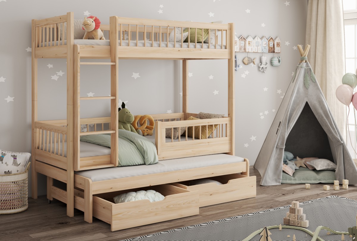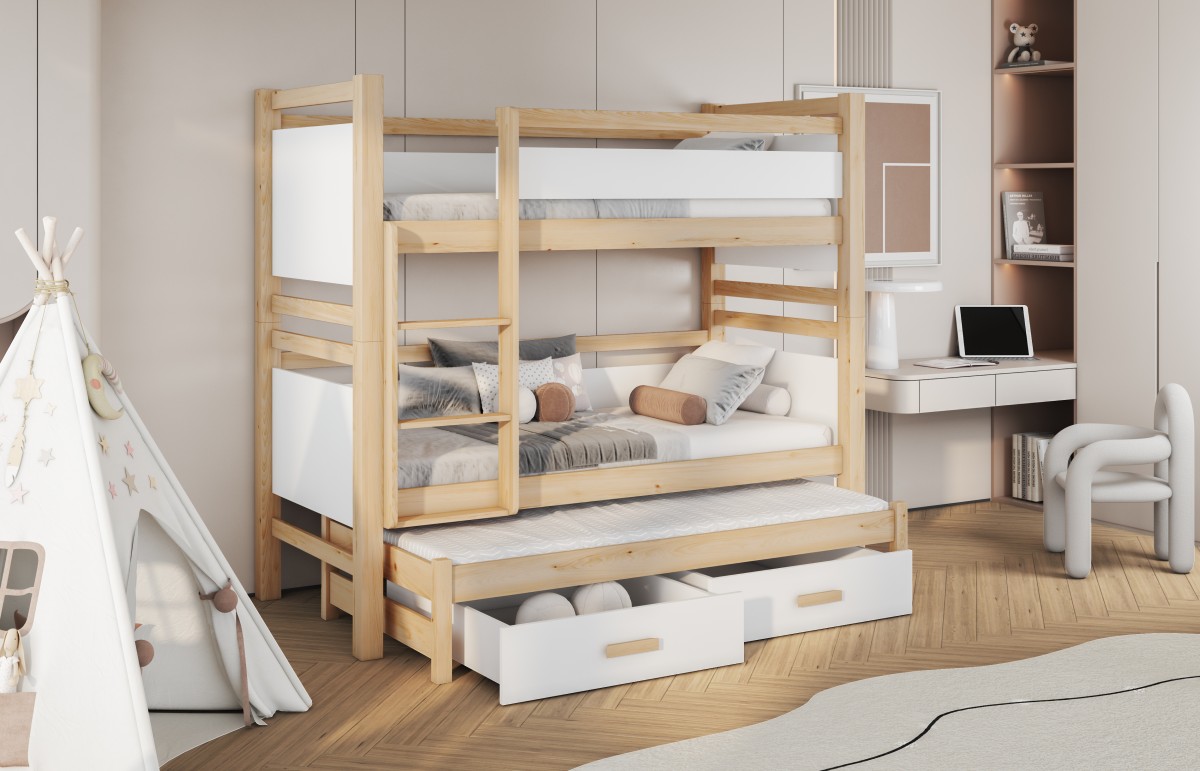 Być może jesteście wieloosobową rodziną, która nie dysponuje metrażem mieszkania pozwalającym każdemu dziecku na posiadanie własnego pokoju... Lub uwielbiacie spędzać ze swoim rodzeństwem i ich potomstwem wspólnie czas? A może jesteście blisko związani z inną rodziną i lubicie wspólne, gwarne weekendy? Bez względu na to, czy potrzebujecie Państwo rozwiązania dla okazjonalnego czy codziennego przenocowania trójki dzieci, mamy idealne rozwiązanie. Trzyosobowe łóżko piętrowe na co dzień może być przeznaczone dla dwójki dzieci, wysuwana trzecia szuflada może być tzw."awaryjnym" - gościnnym łóżkiem dla kolegi, przyjaciółki, kuzynostwa... Stabilna konstrukcja, drewniany oryginalny design oraz wygodne materace to atuty tego codziennego mebla przeznaczonego do codziennego spania. Dzięki wysuwanej szufladzie, w której schowany jest dodatkowy tapczanik, oszczędzacie Państwo miejsce, a za dnia pokój może tętnić życiem towarzyskim. Co ważne, łóżko posiada dwie szuflady - pojemniki na pościel. To bardzo funkcjonalne rozwiązanie cieszy się dużym uznaniem wśród naszych Klientów, zarówno jako wyposażenie własnych mieszkań, domów, ale i domków letniskowych.