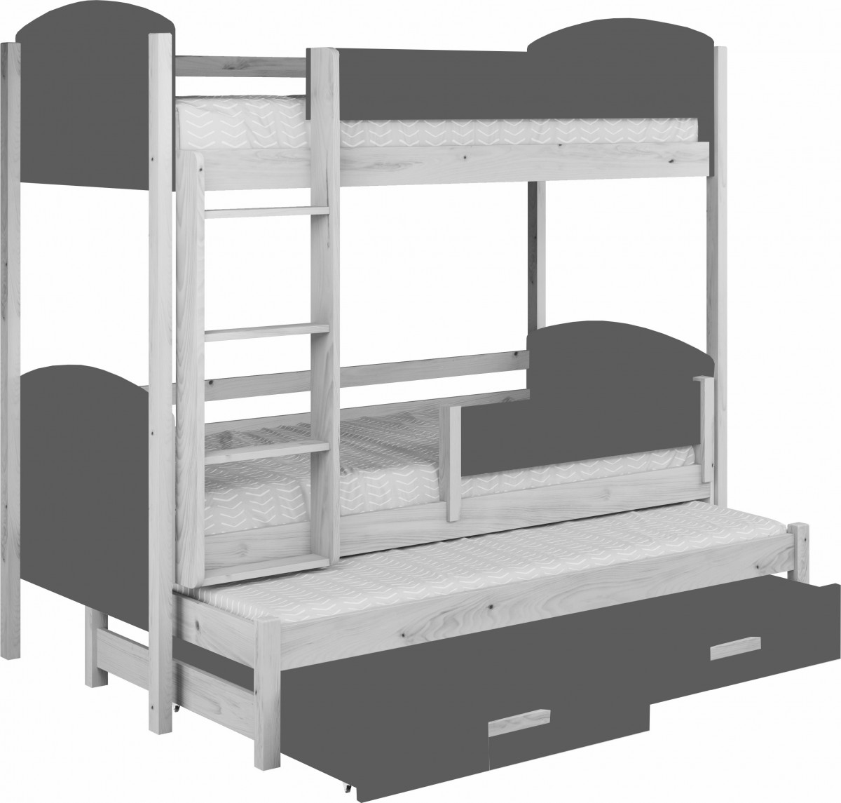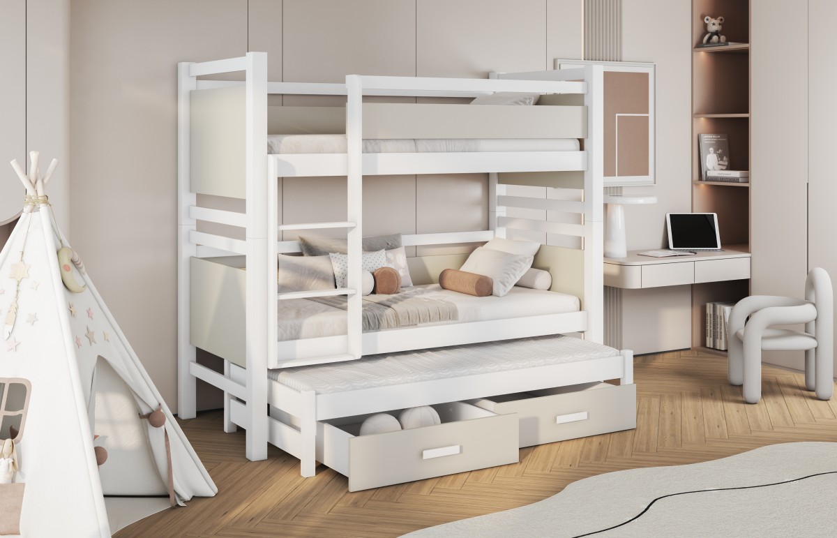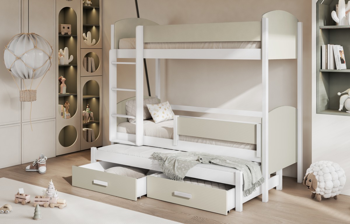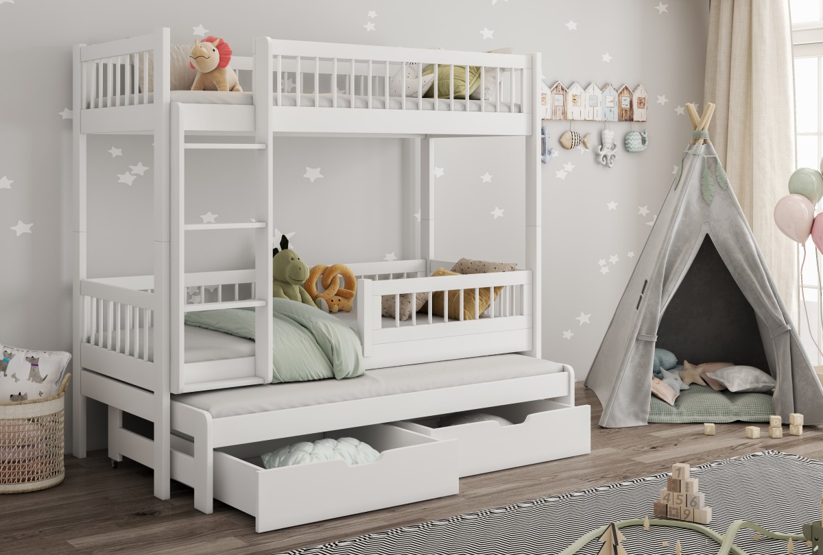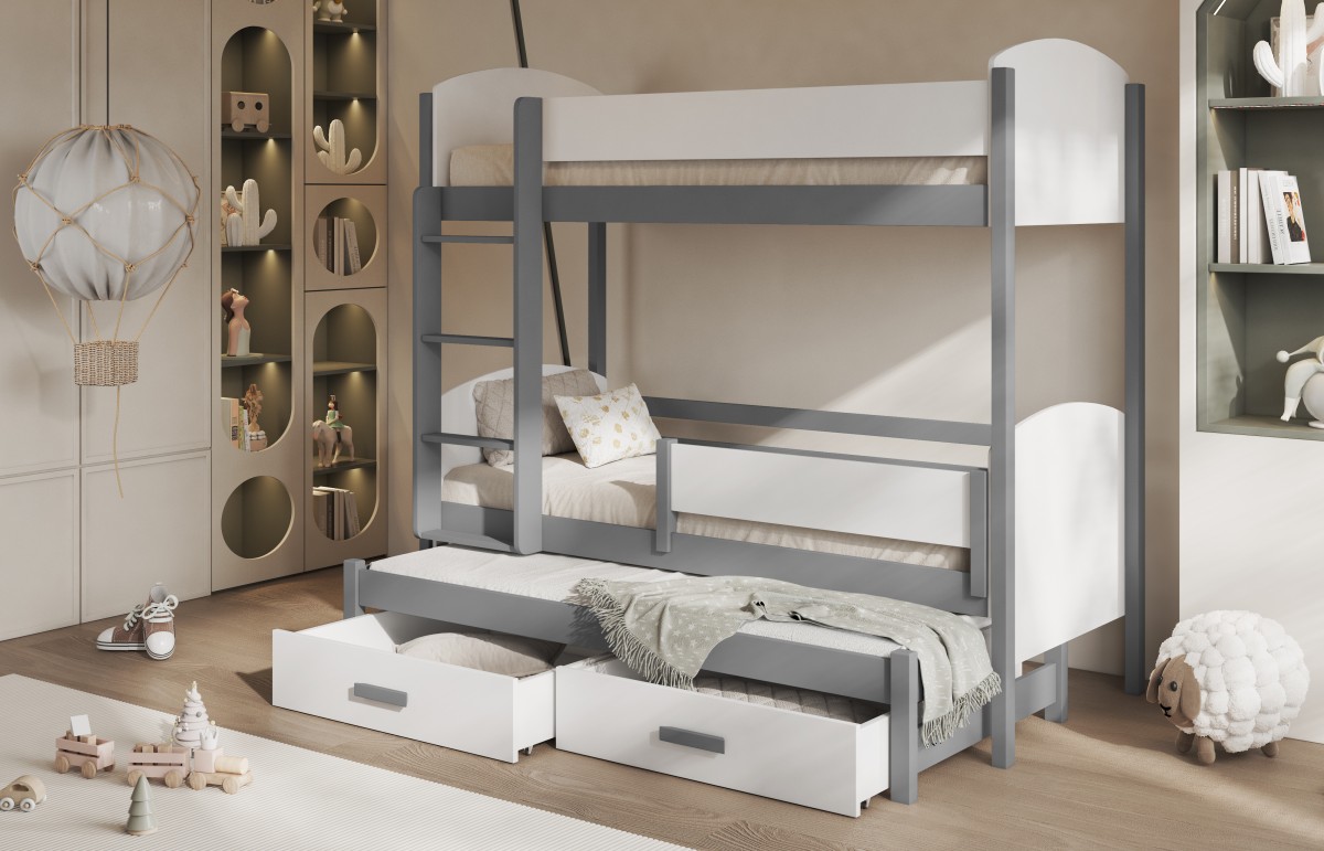 Być może jesteście wieloosobową rodziną, która nie dysponuje metrażem mieszkania pozwalającym każdemu dziecku na posiadanie własnego pokoju... Lub uwielbiacie spędzać ze swoim rodzeństwem i ich potomstwem wspólnie czas? A może jesteście blisko związani z inną rodziną i lubicie wspólne, gwarne weekendy? Bez względu na to, czy potrzebujecie Państwo rozwiązania dla okazjonalnego czy codziennego przenocowania trójki dzieci, mamy idealne rozwiązanie. Trzyosobowe łóżko piętrowe na co dzień może być przeznaczone dla dwójki dzieci, wysuwana trzecia szuflada może być tzw."awaryjnym" - gościnnym łóżkiem dla kolegi, przyjaciółki, kuzynostwa... Stabilna konstrukcja, drewniany oryginalny design oraz wygodne materace to atuty tego codziennego mebla przeznaczonego do codziennego spania. Dzięki wysuwanej szufladzie, w której schowany jest dodatkowy tapczanik, oszczędzacie Państwo miejsce, a za dnia pokój może tętnić życiem towarzyskim. Co ważne, łóżko posiada dwie szuflady - pojemniki na pościel. To bardzo funkcjonalne rozwiązanie cieszy się dużym uznaniem wśród naszych Klientów, zarówno jako wyposażenie własnych mieszkań, domów, ale i domków letniskowych.