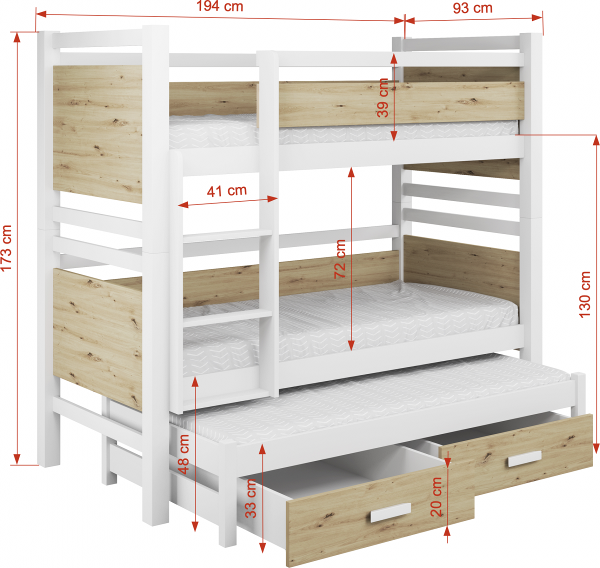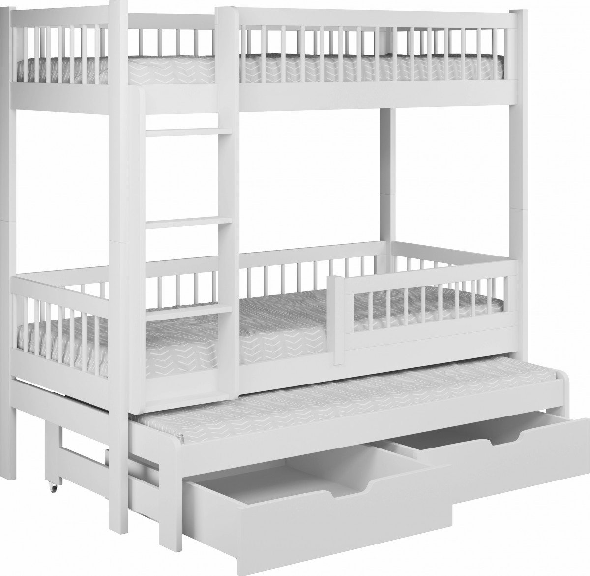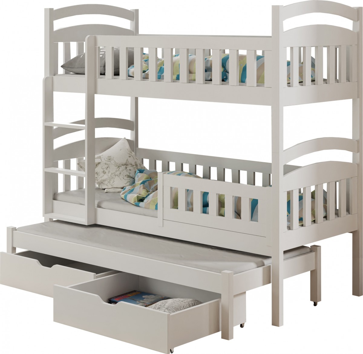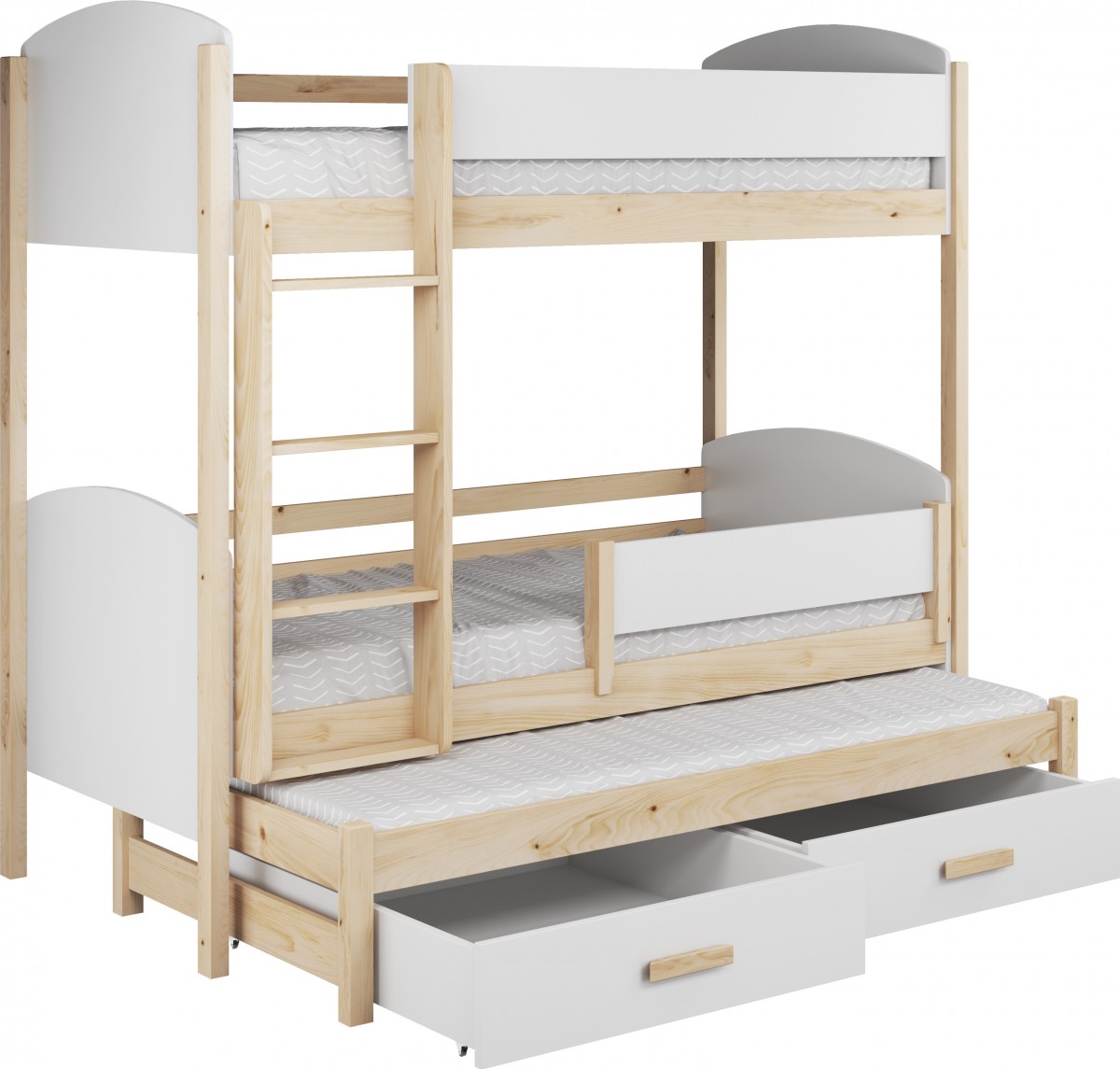 Być może jesteście wieloosobową rodziną, która nie dysponuje metrażem mieszkania pozwalającym każdemu dziecku na posiadanie własnego pokoju... Lub uwielbiacie spędzać ze swoim rodzeństwem i ich potomstwem wspólnie czas? A może jesteście blisko związani z inną rodziną i lubicie wspólne, gwarne weekendy? Bez względu na to, czy potrzebujecie Państwo rozwiązania dla okazjonalnego czy codziennego przenocowania trójki dzieci, mamy idealne rozwiązanie. Trzyosobowe łóżko piętrowe na co dzień może być przeznaczone dla dwójki dzieci, wysuwana trzecia szuflada może być tzw."awaryjnym" - gościnnym łóżkiem dla kolegi, przyjaciółki, kuzynostwa... Stabilna konstrukcja, drewniany oryginalny design oraz wygodne materace to atuty tego codziennego mebla przeznaczonego do codziennego spania. Dzięki wysuwanej szufladzie, w której schowany jest dodatkowy tapczanik, oszczędzacie Państwo miejsce, a za dnia pokój może tętnić życiem towarzyskim. Co ważne, łóżko posiada dwie szuflady - pojemniki na pościel. To bardzo funkcjonalne rozwiązanie cieszy się dużym uznaniem wśród naszych Klientów, zarówno jako wyposażenie własnych mieszkań, domów, ale i domków letniskowych.
