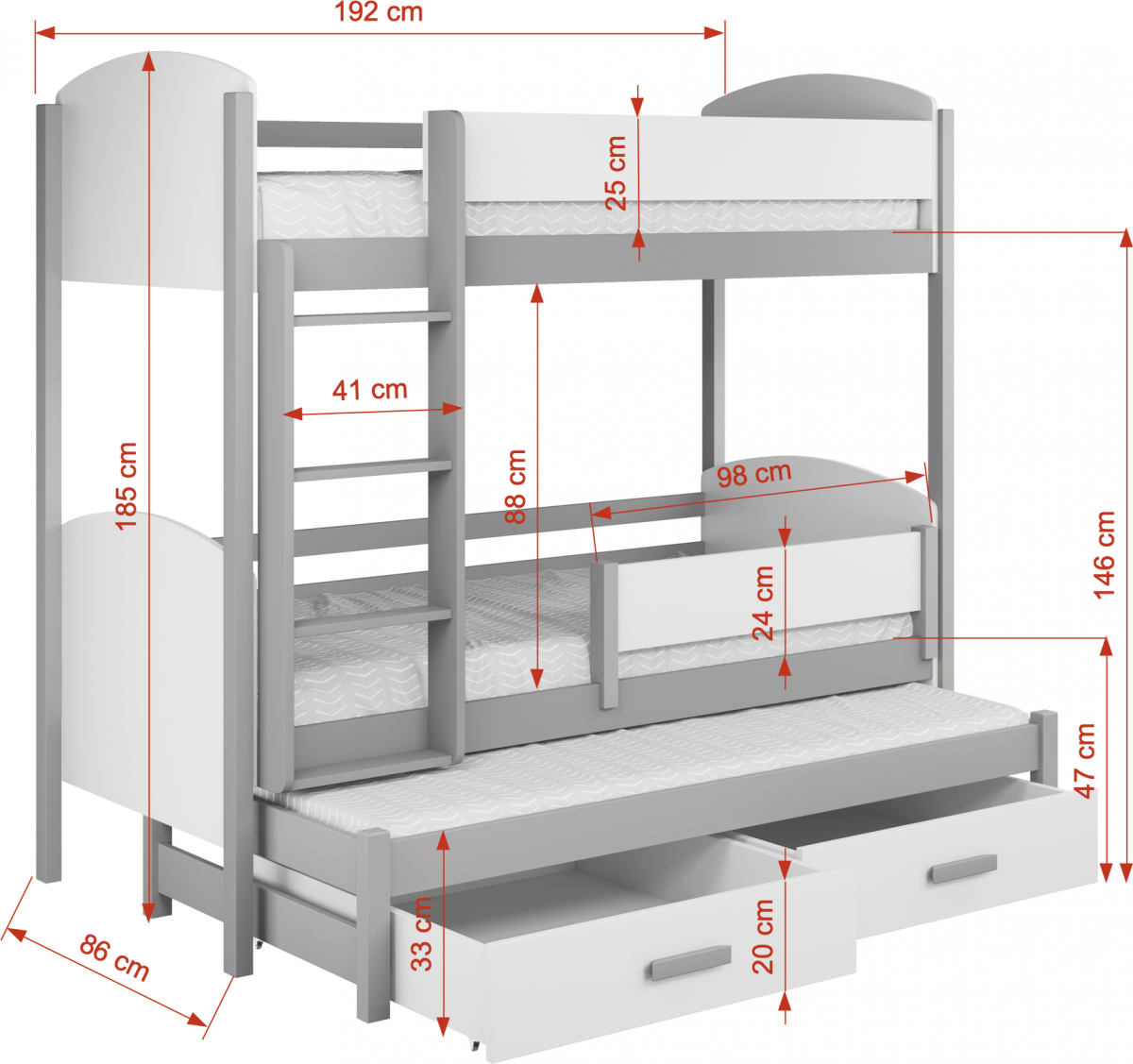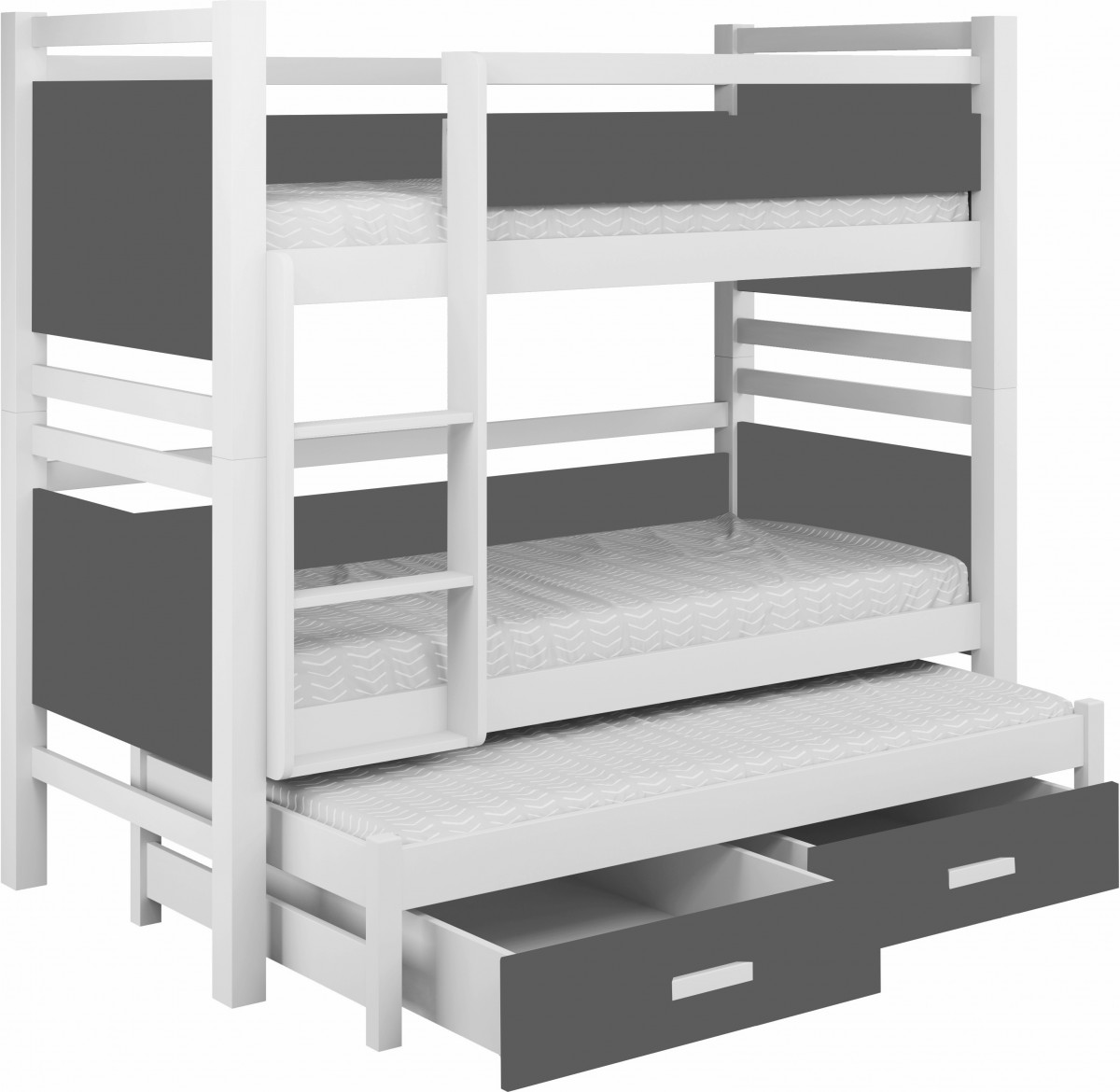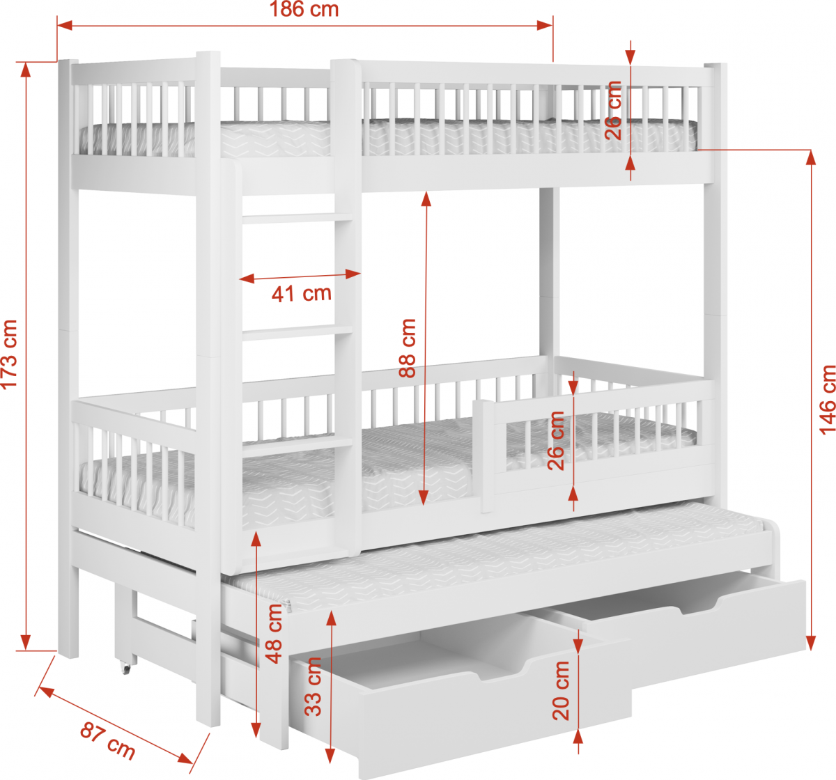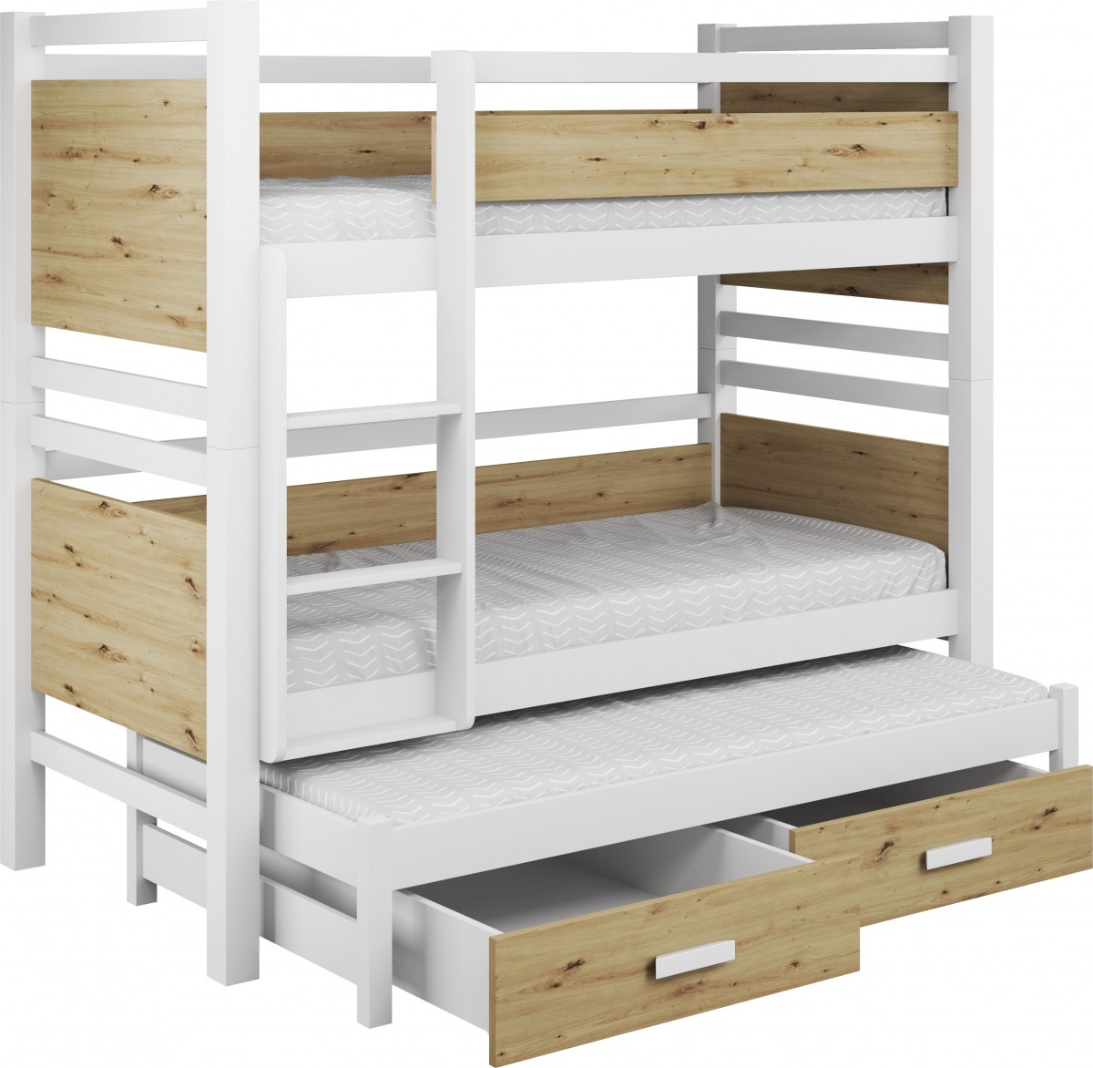 Być może jesteście wieloosobową rodziną, która nie dysponuje metrażem mieszkania pozwalającym każdemu dziecku na posiadanie własnego pokoju... Lub uwielbiacie spędzać ze swoim rodzeństwem i ich potomstwem wspólnie czas? A może jesteście blisko związani z inną rodziną i lubicie wspólne, gwarne weekendy? Bez względu na to, czy potrzebujecie Państwo rozwiązania dla okazjonalnego czy codziennego przenocowania trójki dzieci, mamy idealne rozwiązanie. Trzyosobowe łóżko piętrowe na co dzień może być przeznaczone dla dwójki dzieci, wysuwana trzecia szuflada może być tzw."awaryjnym" - gościnnym łóżkiem dla kolegi, przyjaciółki, kuzynostwa... Stabilna konstrukcja, drewniany oryginalny design oraz wygodne materace to atuty tego codziennego mebla przeznaczonego do codziennego spania. Dzięki wysuwanej szufladzie, w której schowany jest dodatkowy tapczanik, oszczędzacie Państwo miejsce, a za dnia pokój może tętnić życiem towarzyskim. Co ważne, łóżko posiada dwie szuflady - pojemniki na pościel. To bardzo funkcjonalne rozwiązanie cieszy się dużym uznaniem wśród naszych Klientów, zarówno jako wyposażenie własnych mieszkań, domów, ale i domków letniskowych.