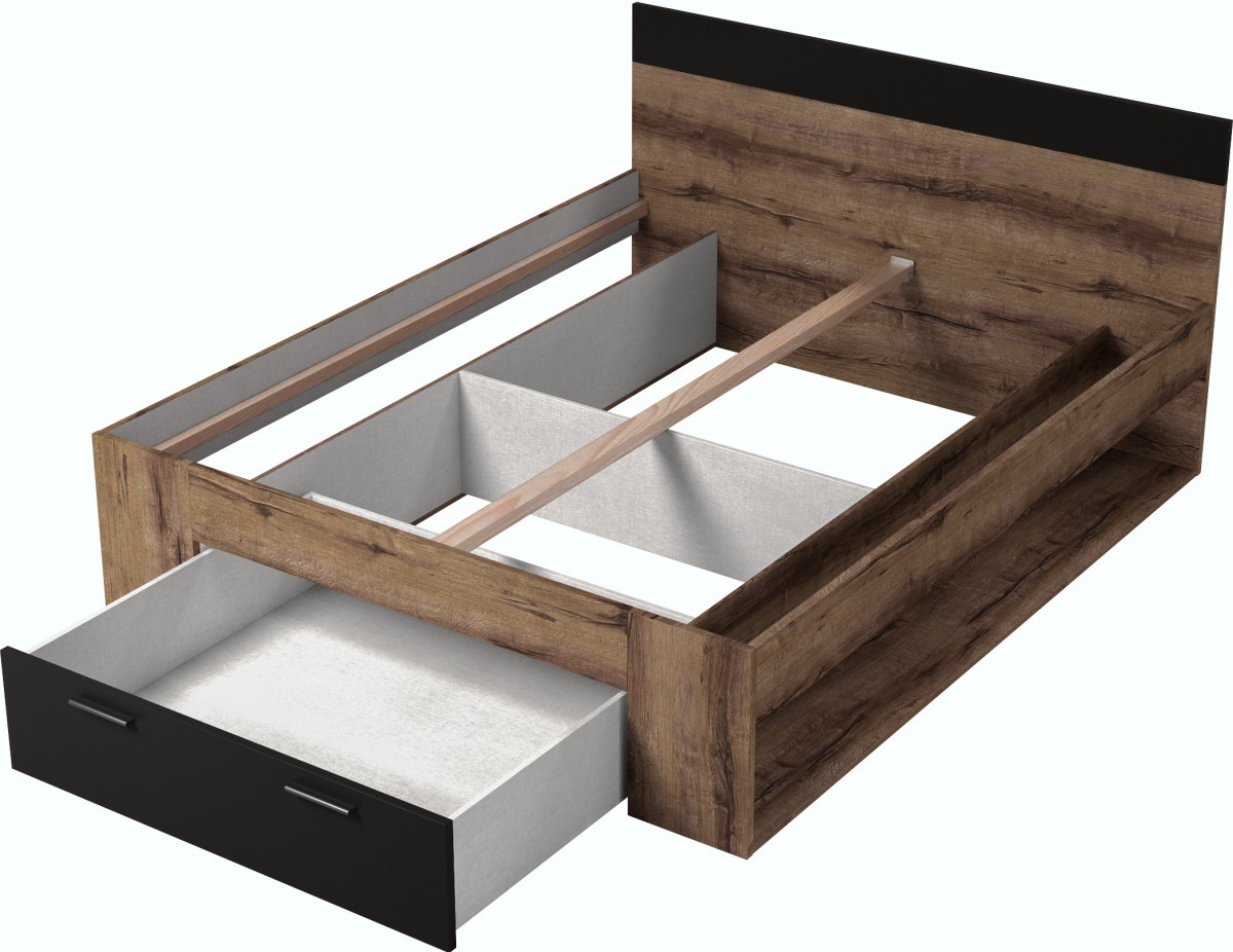Łoże BETA wykonane jest z płyty laminowanej w atrakcyjnym połączeniu kolorów Dębu Monastery z czernią. Do wyboru dla klientów oddajemy dwie wielkości łóżek: 160x200 oraz 180x200. Łoże wyposażone zostało w praktyczną szufladę znajdującą się z przodu mebla, którą można przeznaczyć na pościel lub inne przedmioty. Do łóżka polecamy stolik nocny BETA oraz komodę BETA.