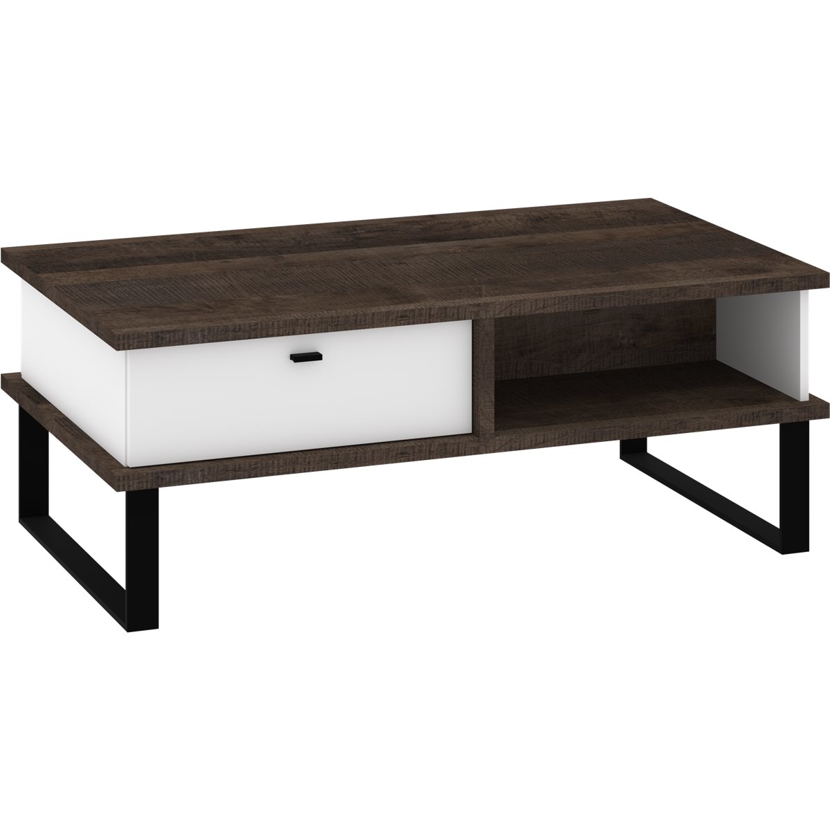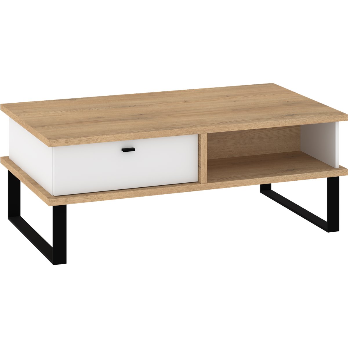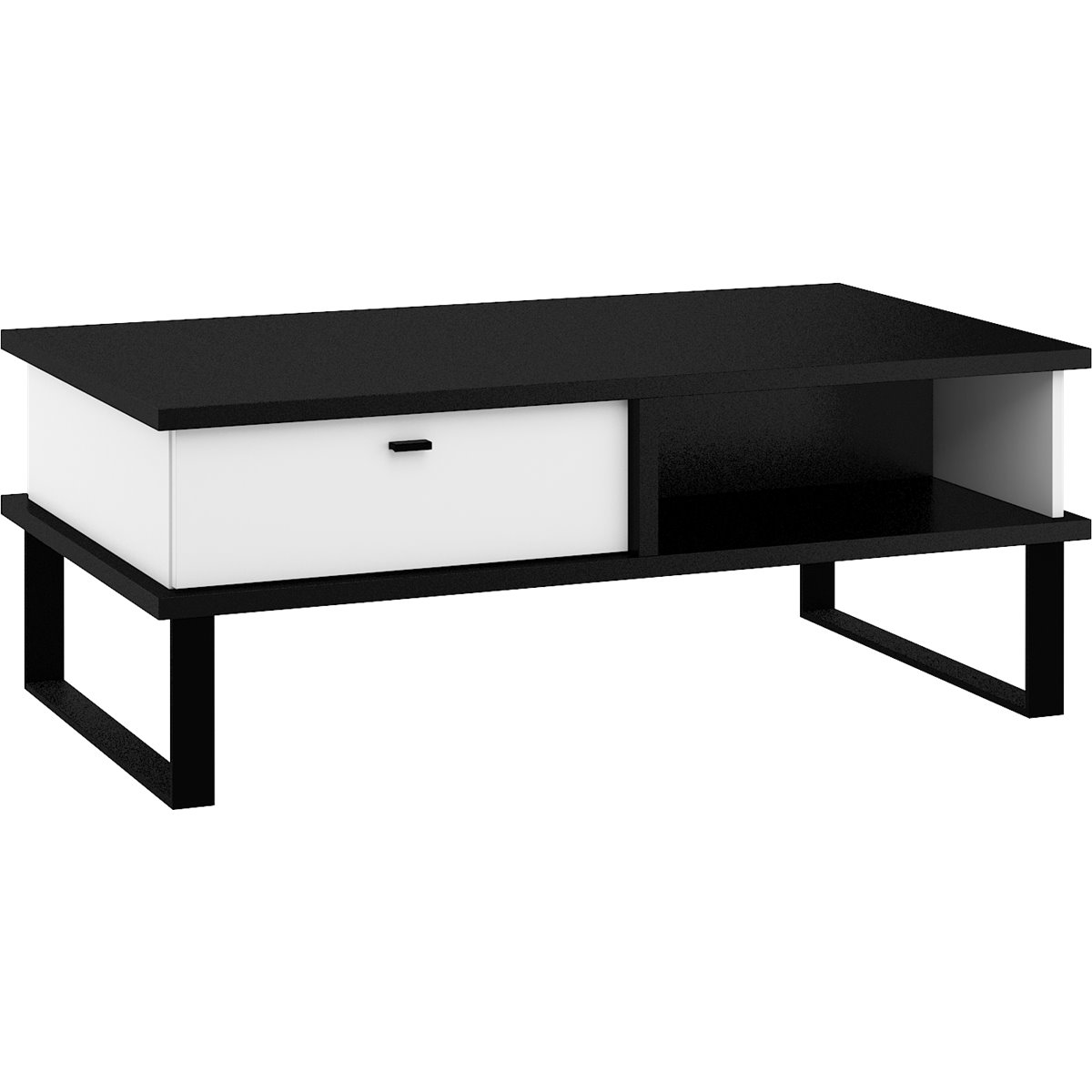 Ława CROSS wyposażona w 2 praktyczne szuflady oraz wnękę. Szuflady w standardzie posiadają cichy domyk co sprawia, że zamykają się płynnie. Metalowe, czarne nóżki podkreślają nowoczesną formę mebla. Dzięki szerokiej gamie kolorów do wyboru na pewno wybierzesz coś dla siebie.