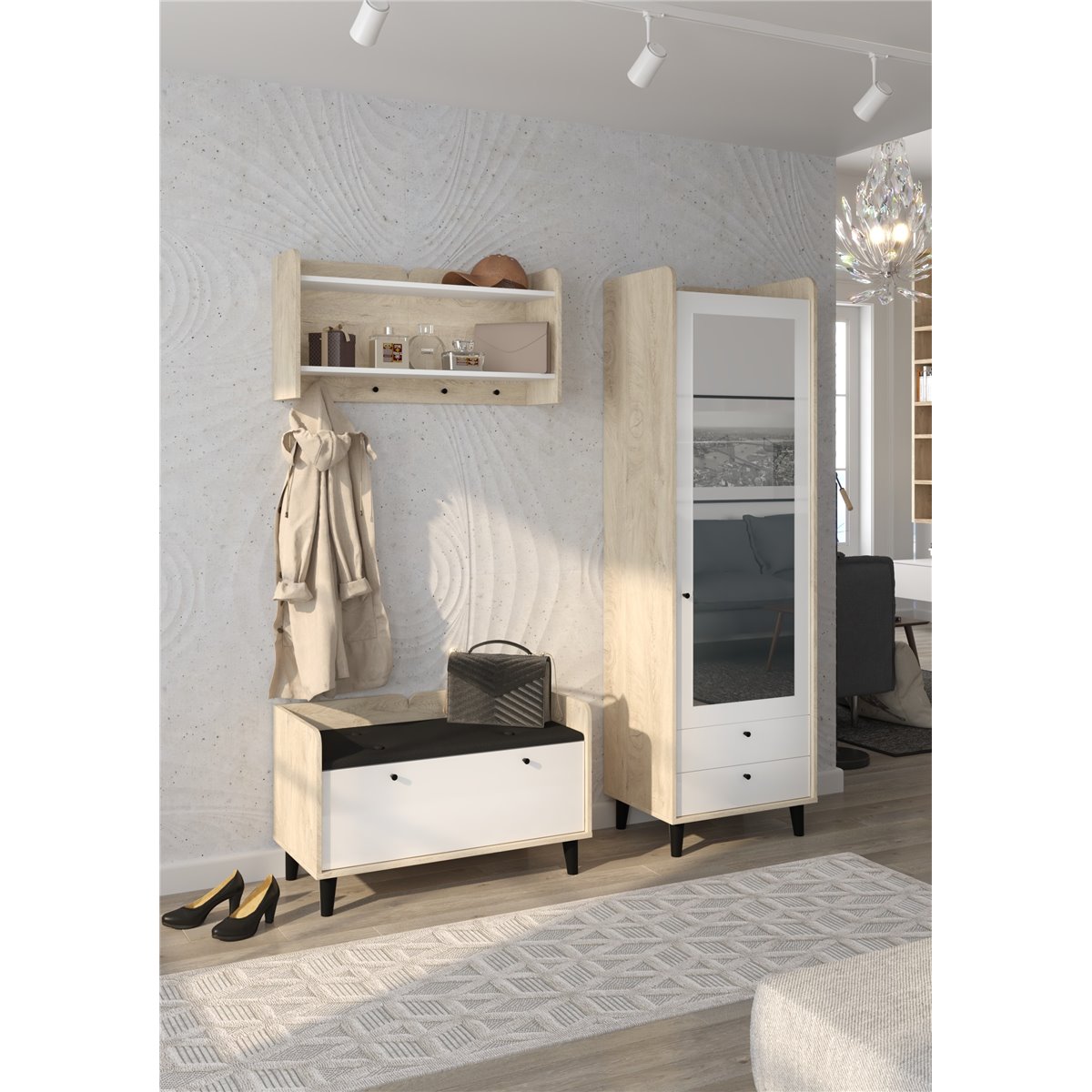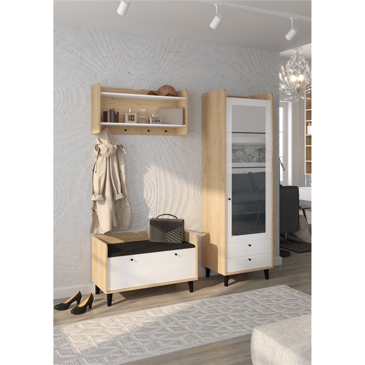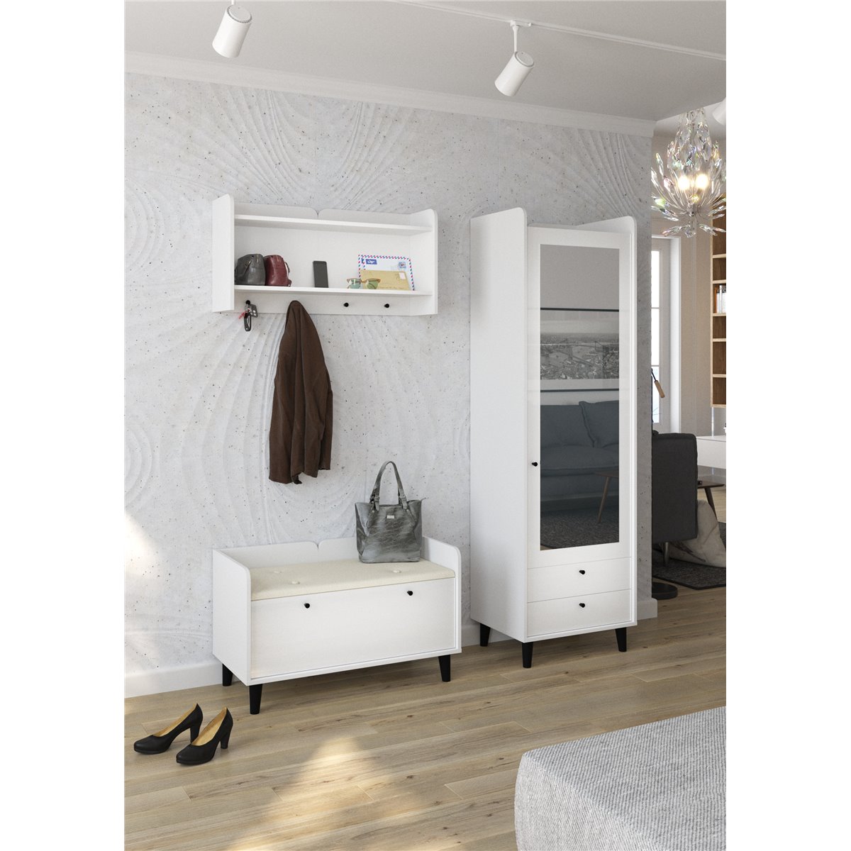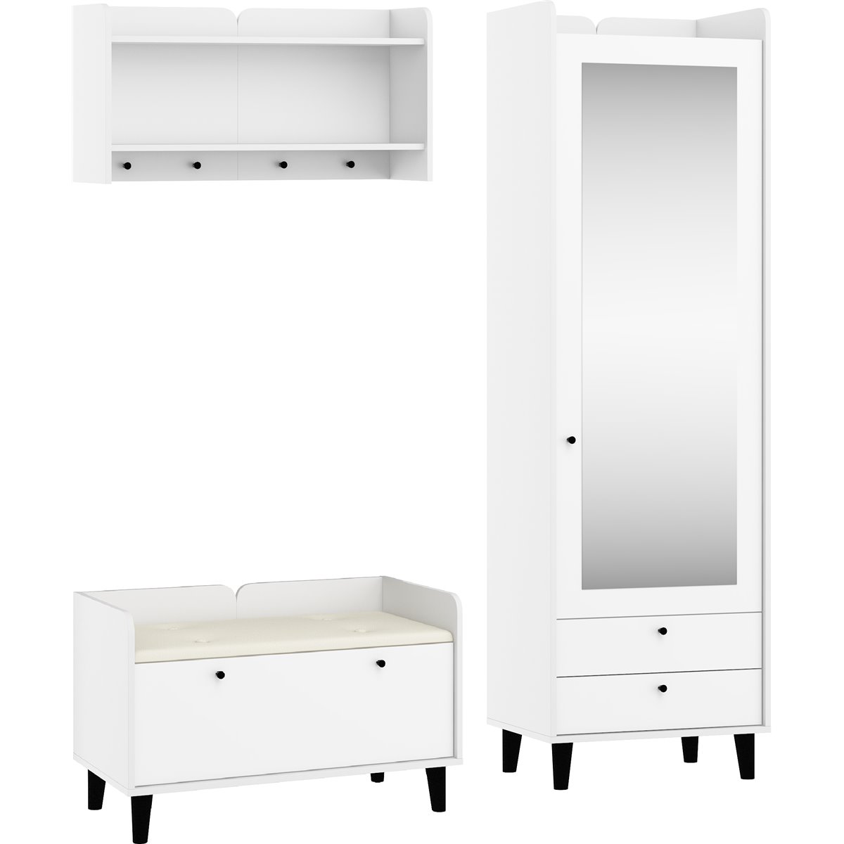Zestaw do przedpokoju DOLCE składa się z 1-drzwiowej szafy z szufladami oraz lustrem na froncie, wieszakiem oraz współgrającej ze wszystkim szafki na buty z kolorem siedziska do wyboru. Drzwi i szuflady w standardzie posiadają cichy domyk co sprawia, że zamykają się płynnie. Drewniane, czarne nóżki podkreślają charakter mebla. Dzięki szerokiej gamie kolorów do wyboru na pewno wybierzesz coś dla siebie.