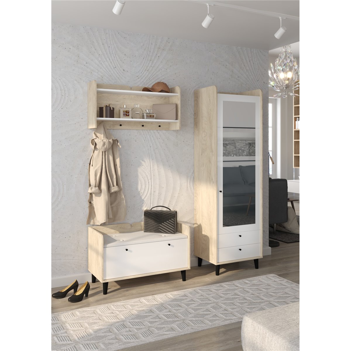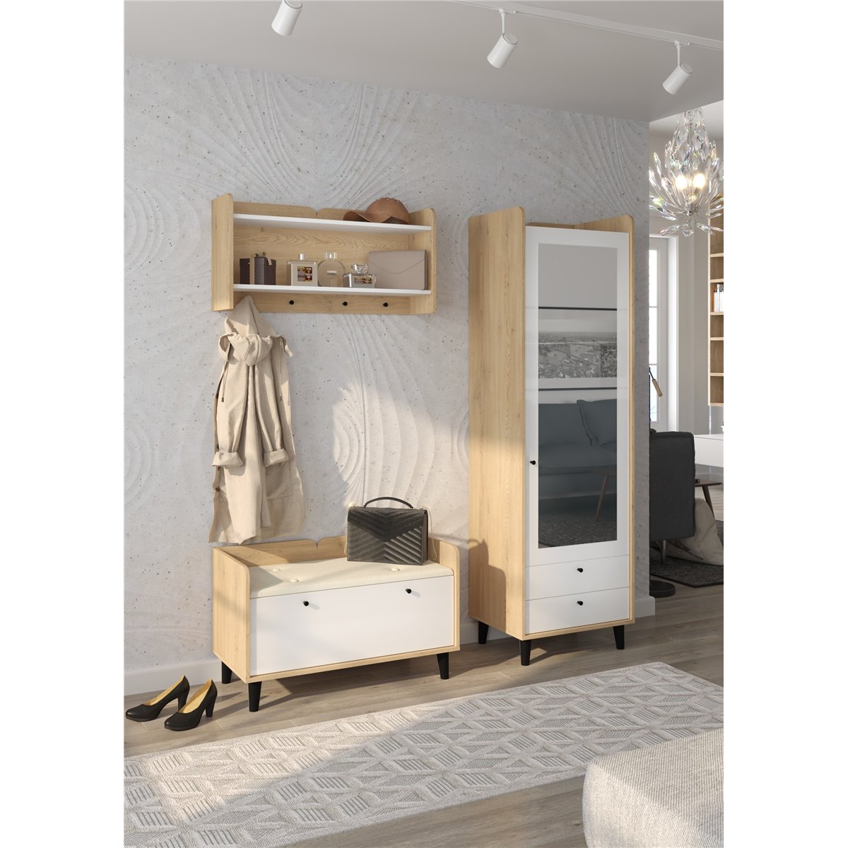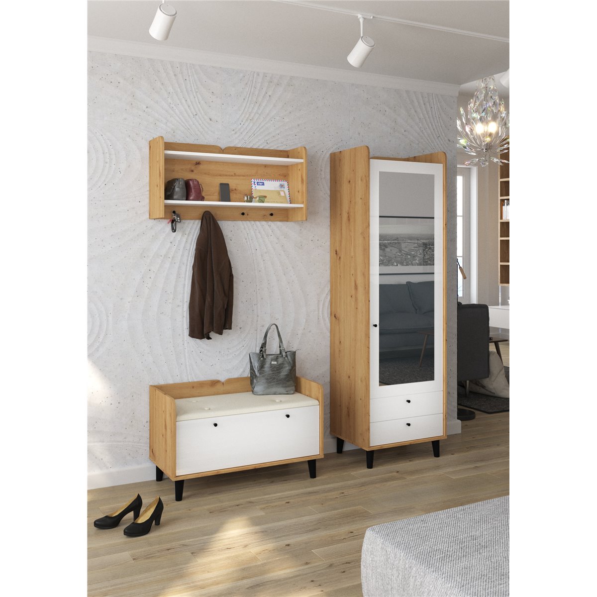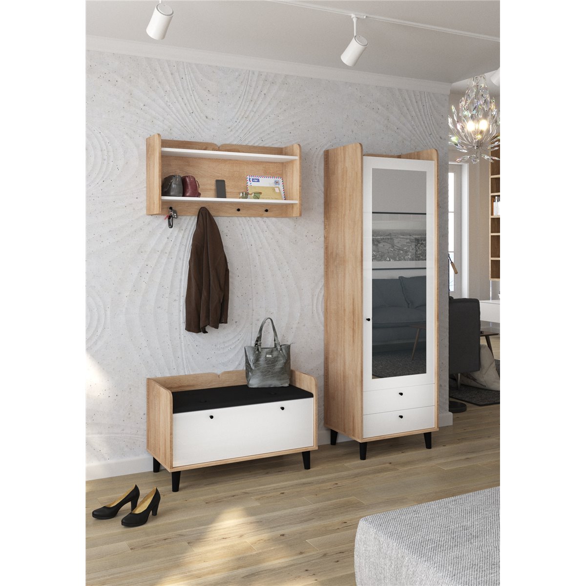 Zestaw do przedpokoju DOLCE składa się z 1-drzwiowej szafy z szufladami oraz lustrem na froncie, wieszakiem oraz współgrającej ze wszystkim szafki na buty z kolorem siedziska do wyboru. Drzwi i szuflady w standardzie posiadają cichy domyk co sprawia, że zamykają się płynnie. Drewniane, czarne nóżki podkreślają charakter mebla. Dzięki szerokiej gamie kolorów do wyboru na pewno wybierzesz coś dla siebie.