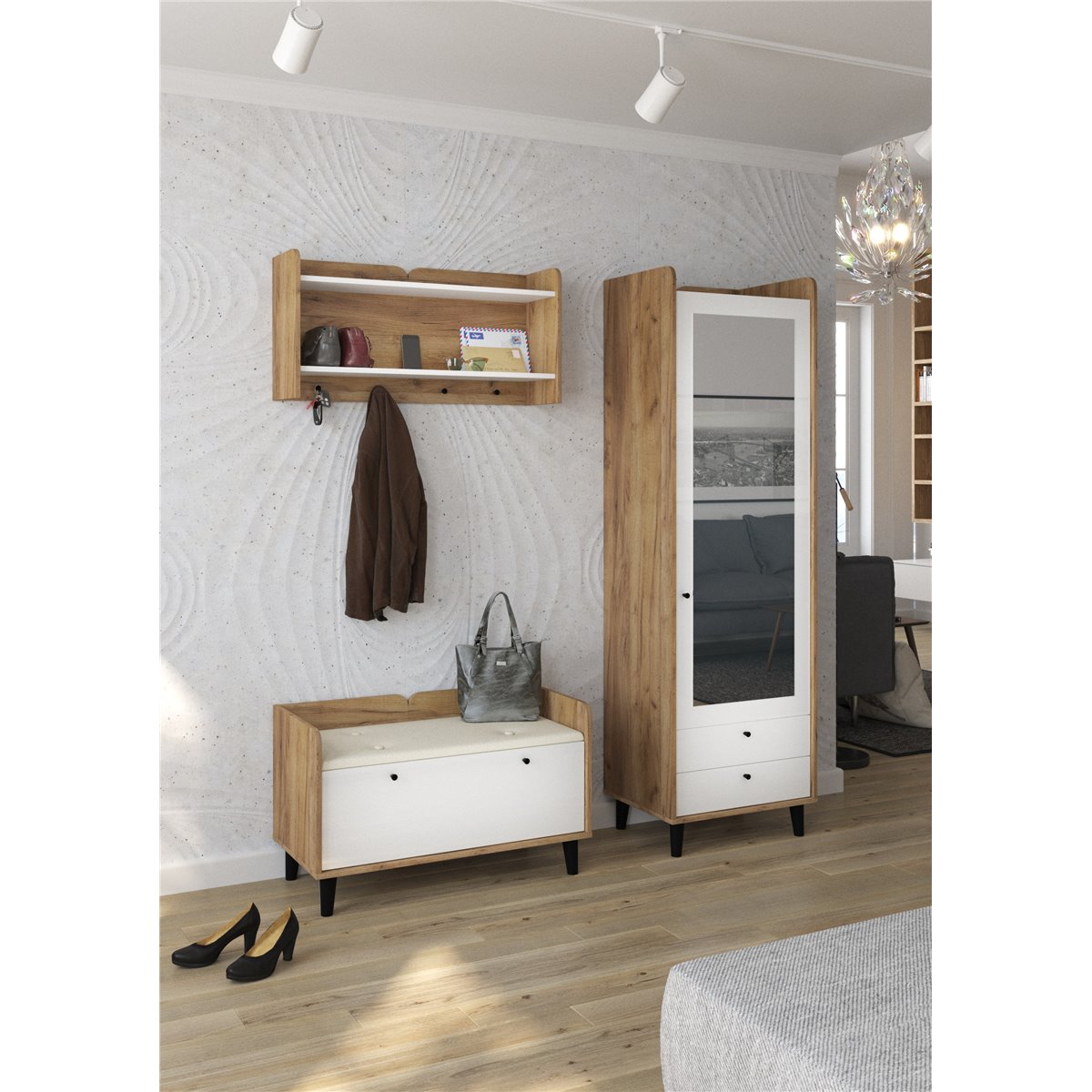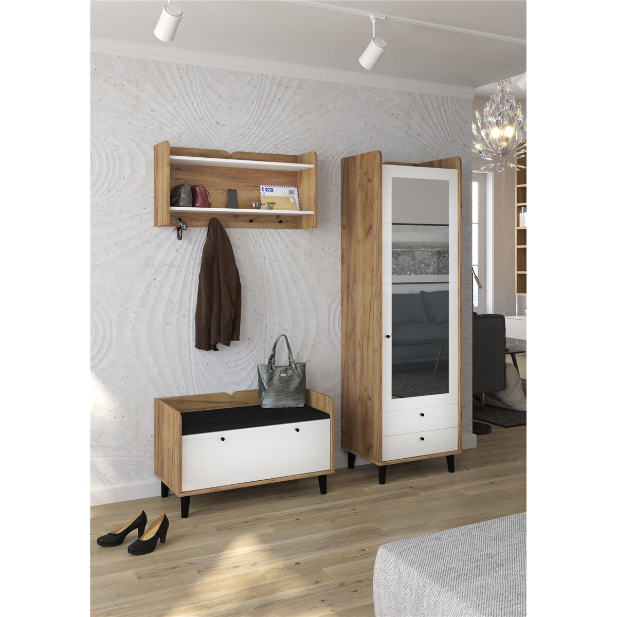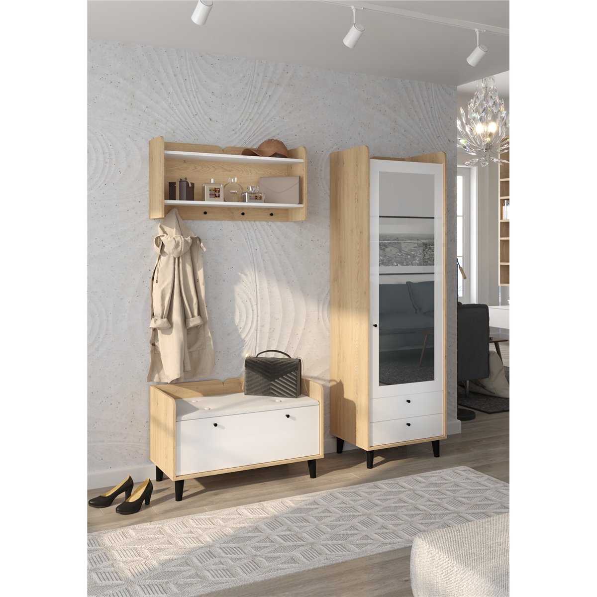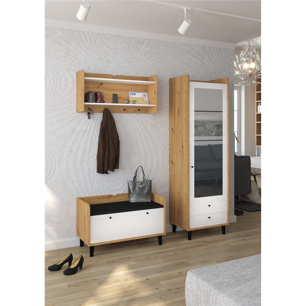 Zestaw do przedpokoju DOLCE składa się z 1-drzwiowej szafy z szufladami oraz lustrem na froncie, wieszakiem oraz współgrającej ze wszystkim szafki na buty z kolorem siedziska do wyboru. Drzwi i szuflady w standardzie posiadają cichy domyk co sprawia, że zamykają się płynnie. Drewniane, czarne nóżki podkreślają charakter mebla. Dzięki szerokiej gamie kolorów do wyboru na pewno wybierzesz coś dla siebie.