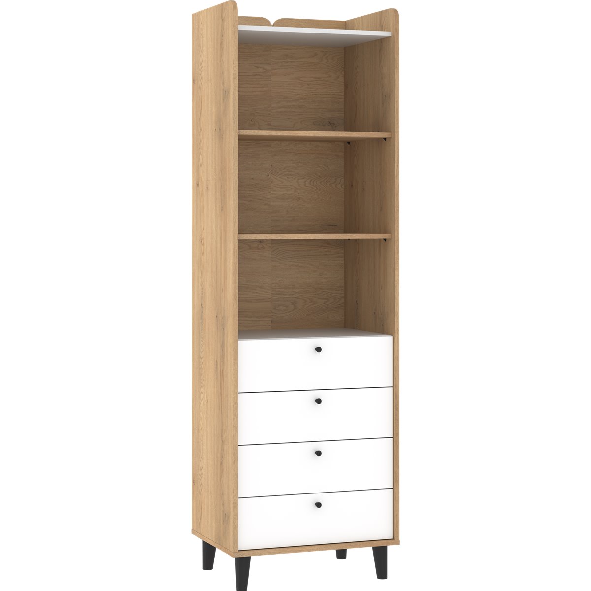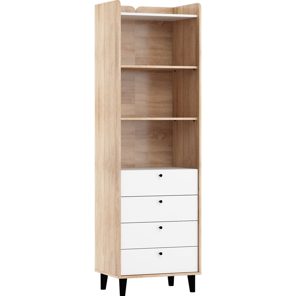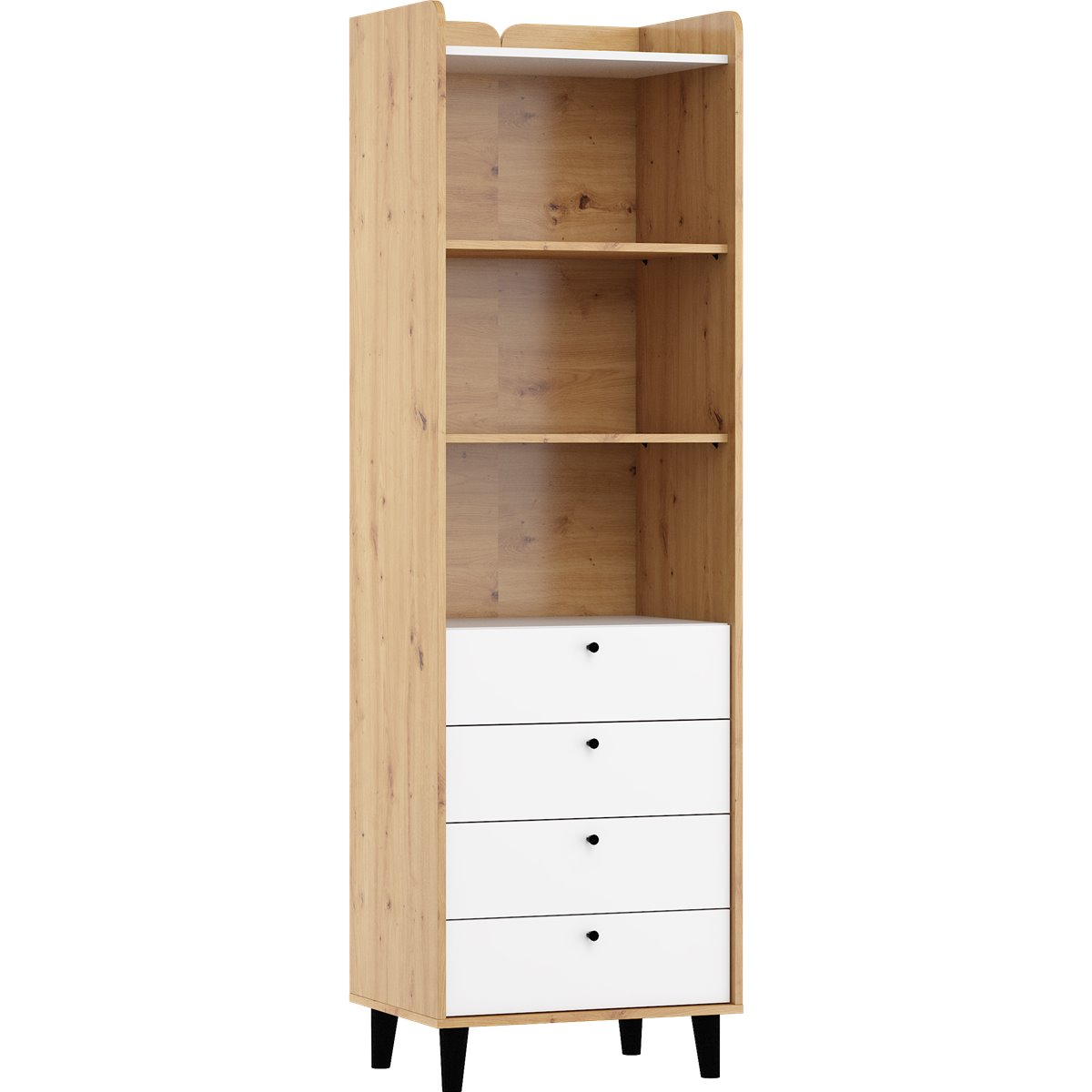 Regał DOLCE wyposażony w 4 praktyczne szuflady. Szuflady w standardzie posiadają cichy domyk co sprawia, że zamykają się płynnie. Drewniane, czarne nóżki podkreślają charakter mebla. Dzięki szerokiej gamie kolorów do wyboru na pewno wybierzesz coś dla siebie.