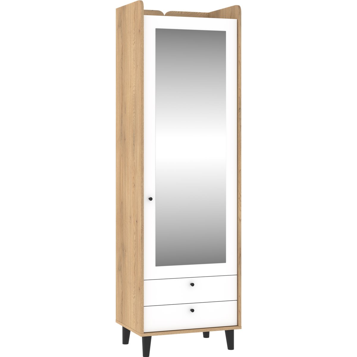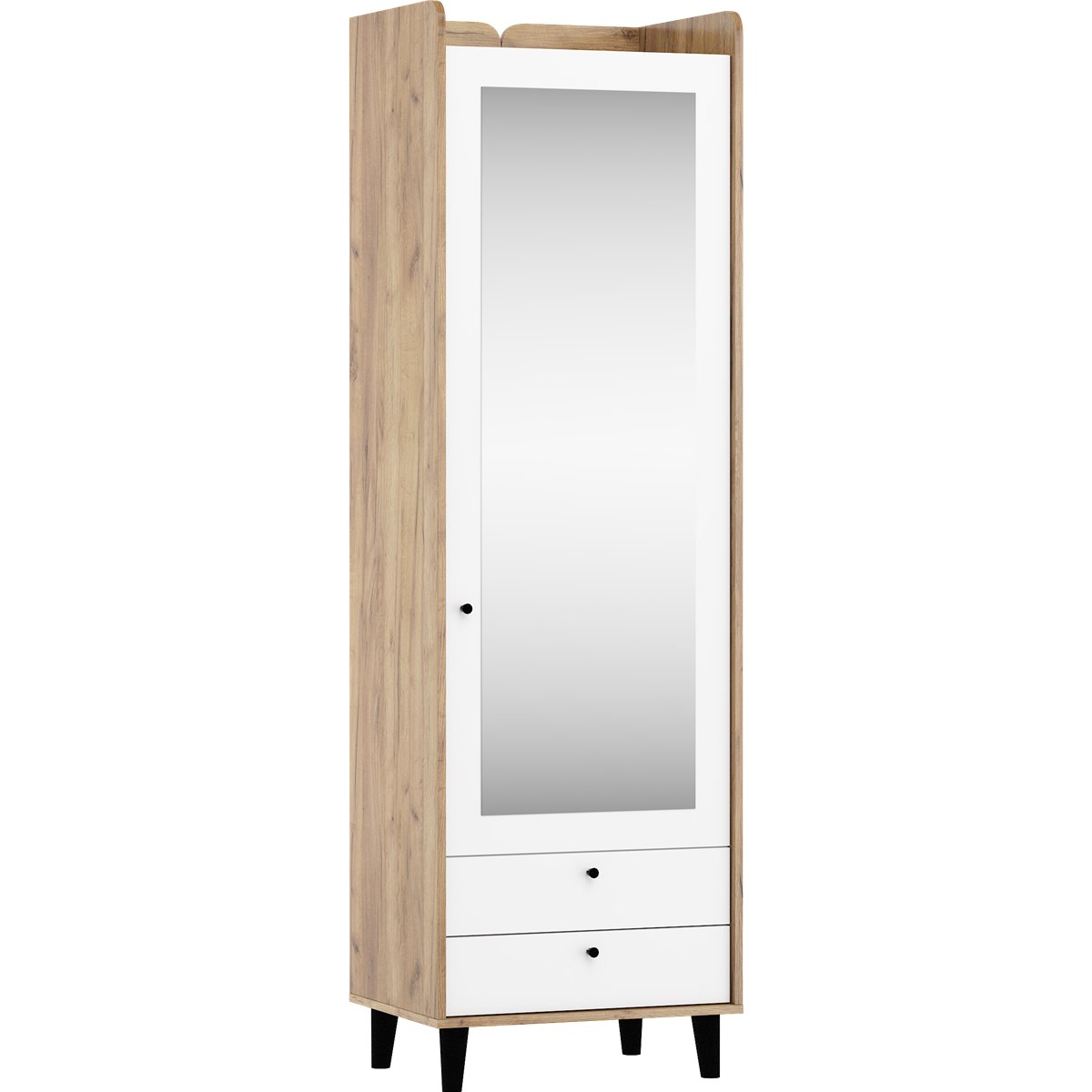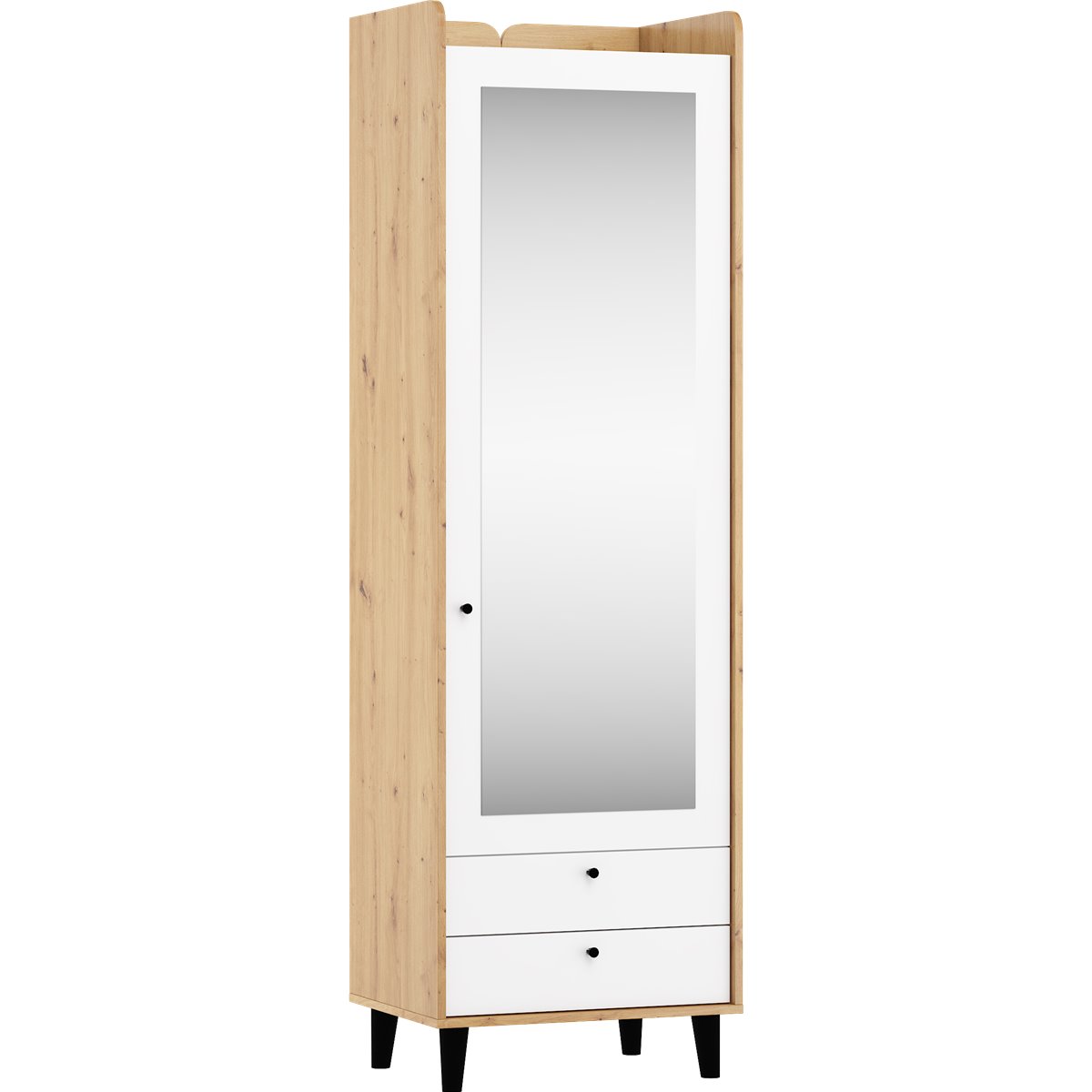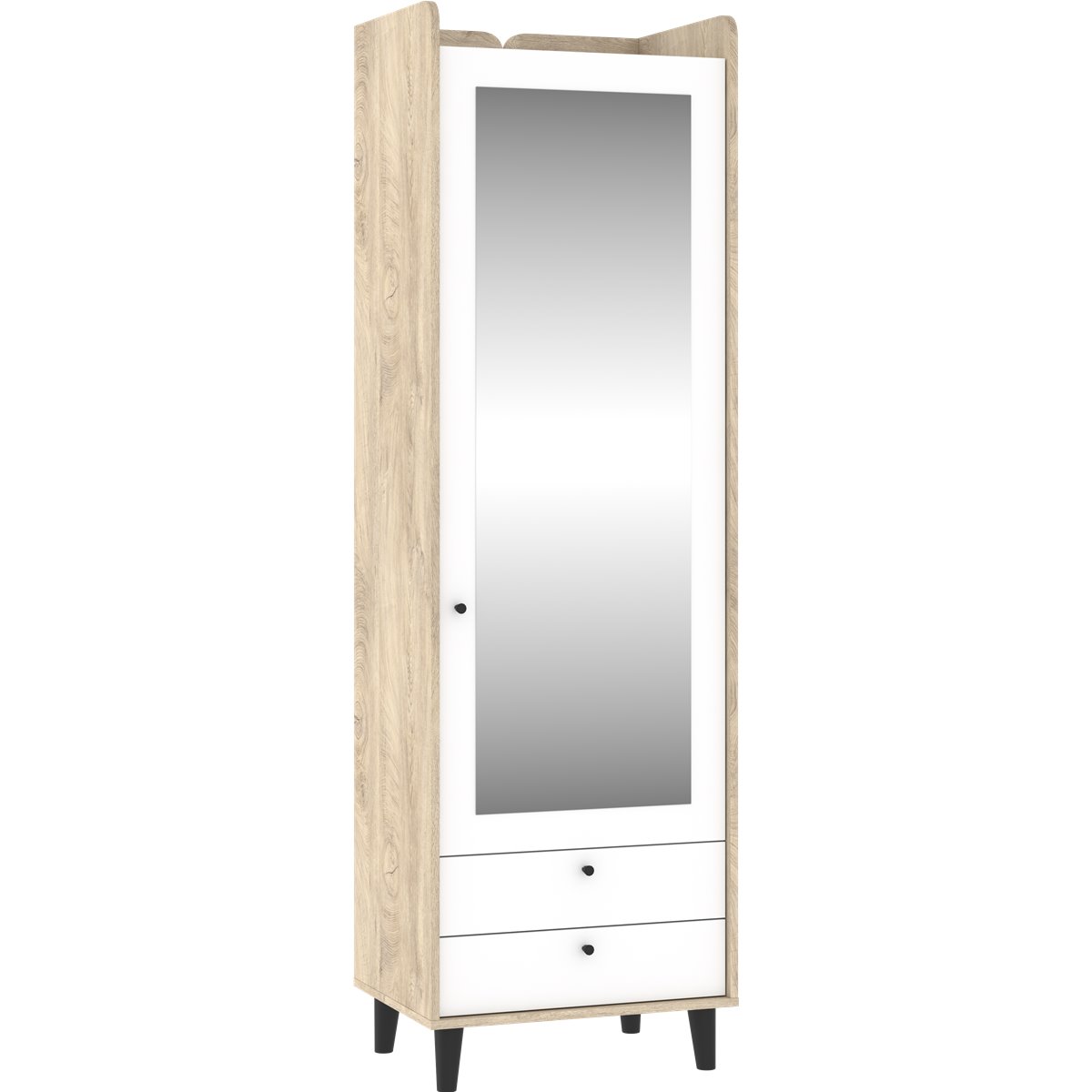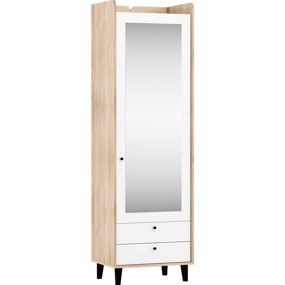 Szafa DOLCE wyposażona w 1-drzwiowy front z lustrem, za którym kryje się półka oraz drążek na wieszaki, poniżej są 2 praktyczne szuflady. Drzwi i szuflady w standardzie posiadają cichy domyk co sprawia, że zamykają się płynnie. Drewniane, czarne nóżki podkreślają charakter mebla. Dzięki szerokiej gamie kolorów do wyboru na pewno wybierzesz coś dla siebie.