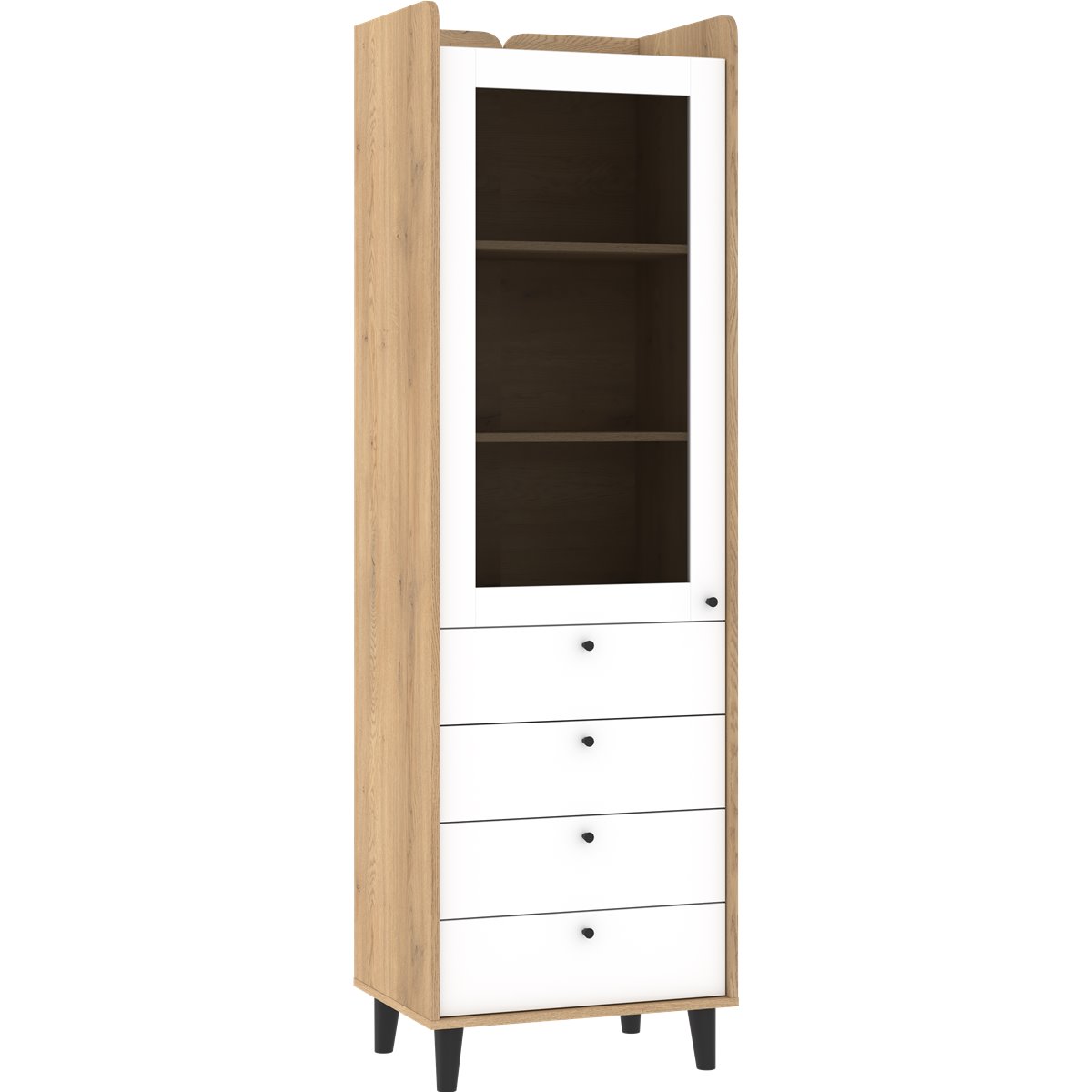 Witryna DOLCE wyposażona w 1-drzwiowy, częściowo przeszklony front za którym kryją się praktyczne półki oraz 4 szuflady. Drzwi i szuflady w standardzie posiadają cichy domyk co sprawia, że zamykają się płynnie. Drewniane, czarne nóżki podkreślają charakter mebla. Dzięki szerokiej gamie kolorów do wyboru na pewno wybierzesz coś dla siebie.