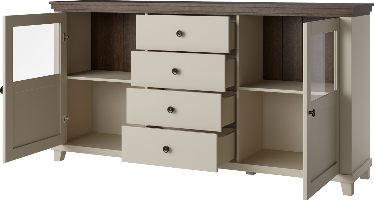 Komoda EVORA w ciekawej kolorystyce zieleni sprawi, że wnętrze stanie się niepowtarzalne. Wyposażona została w 2-drzwiowy, częściowo przeszklony front za którym kryją się praktyczne półki oraz 4 dodatkowe szuflady. Seria doskonale sprawdzi się w pokoju dziennym, w salonie oraz w jadalni. Uchwyty w kolorze złota podkreślają elegancki charakter mebli.