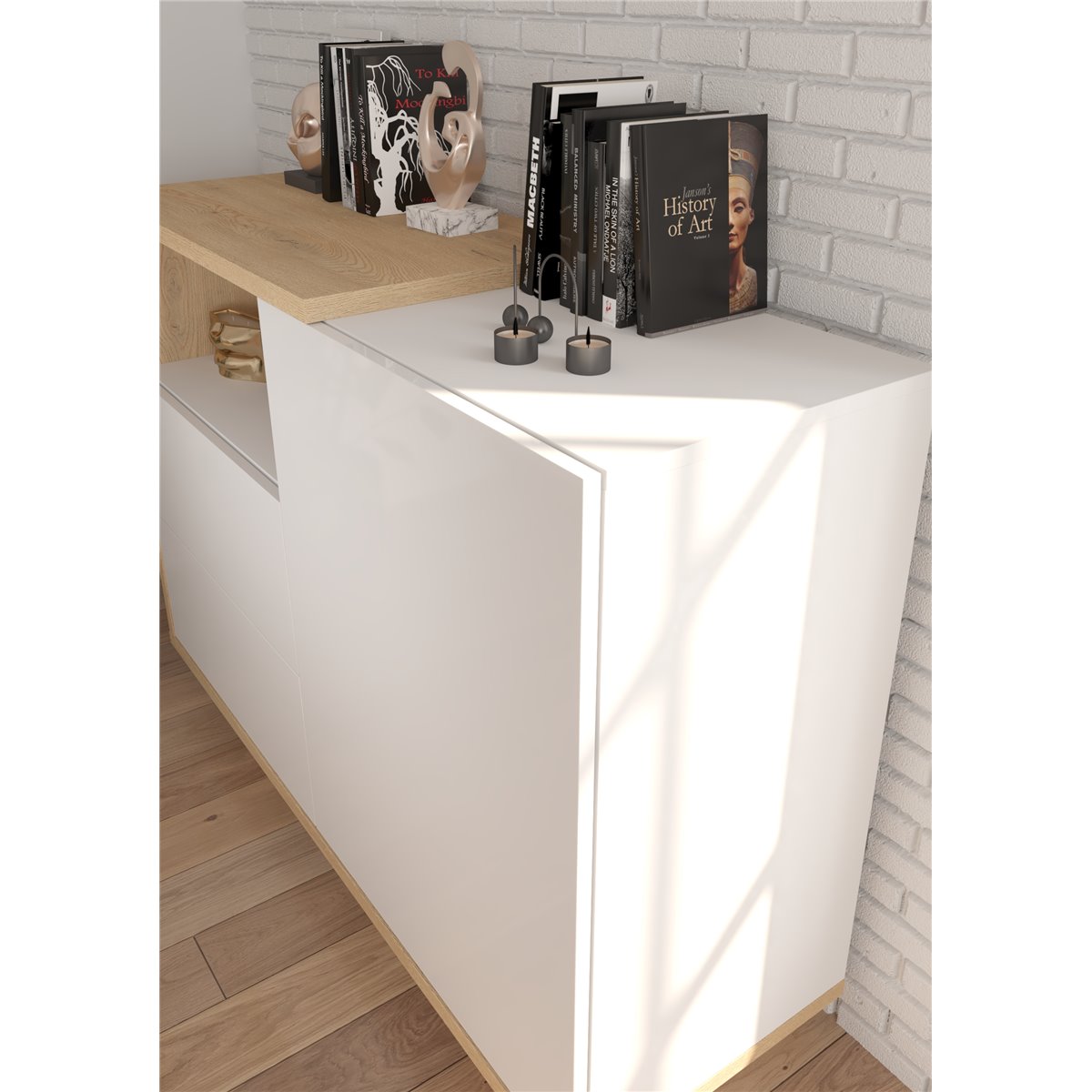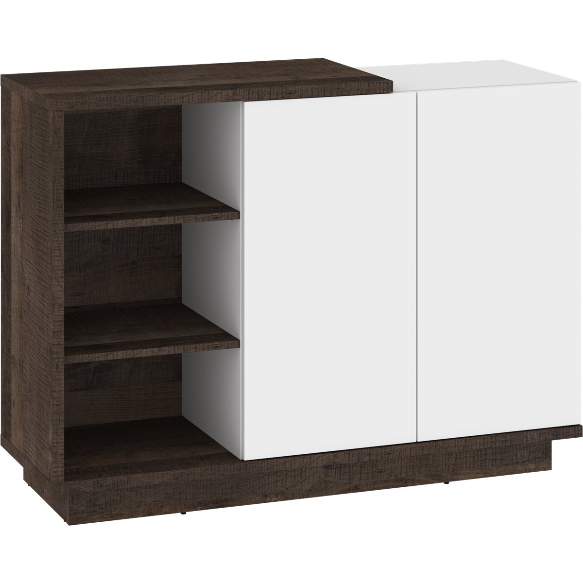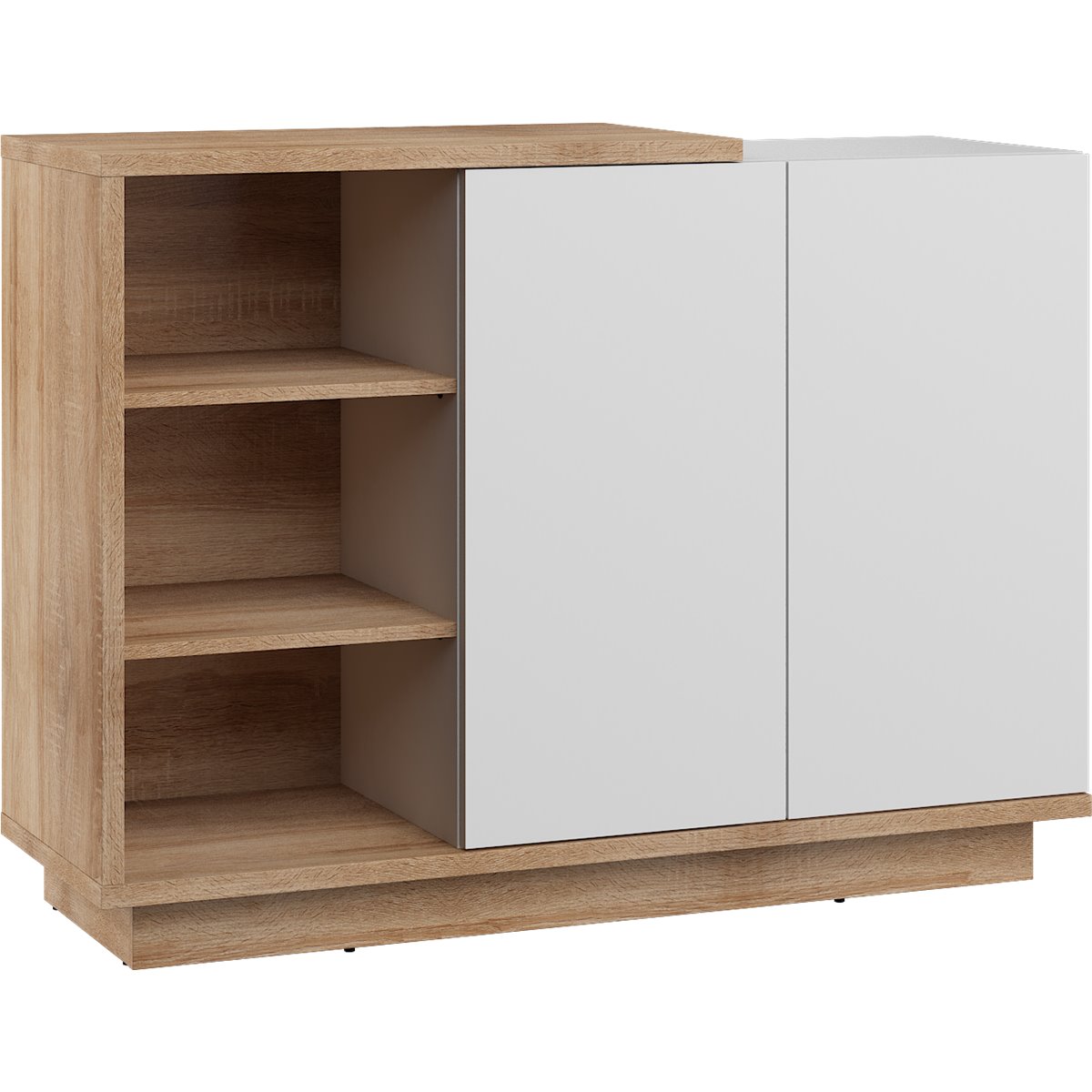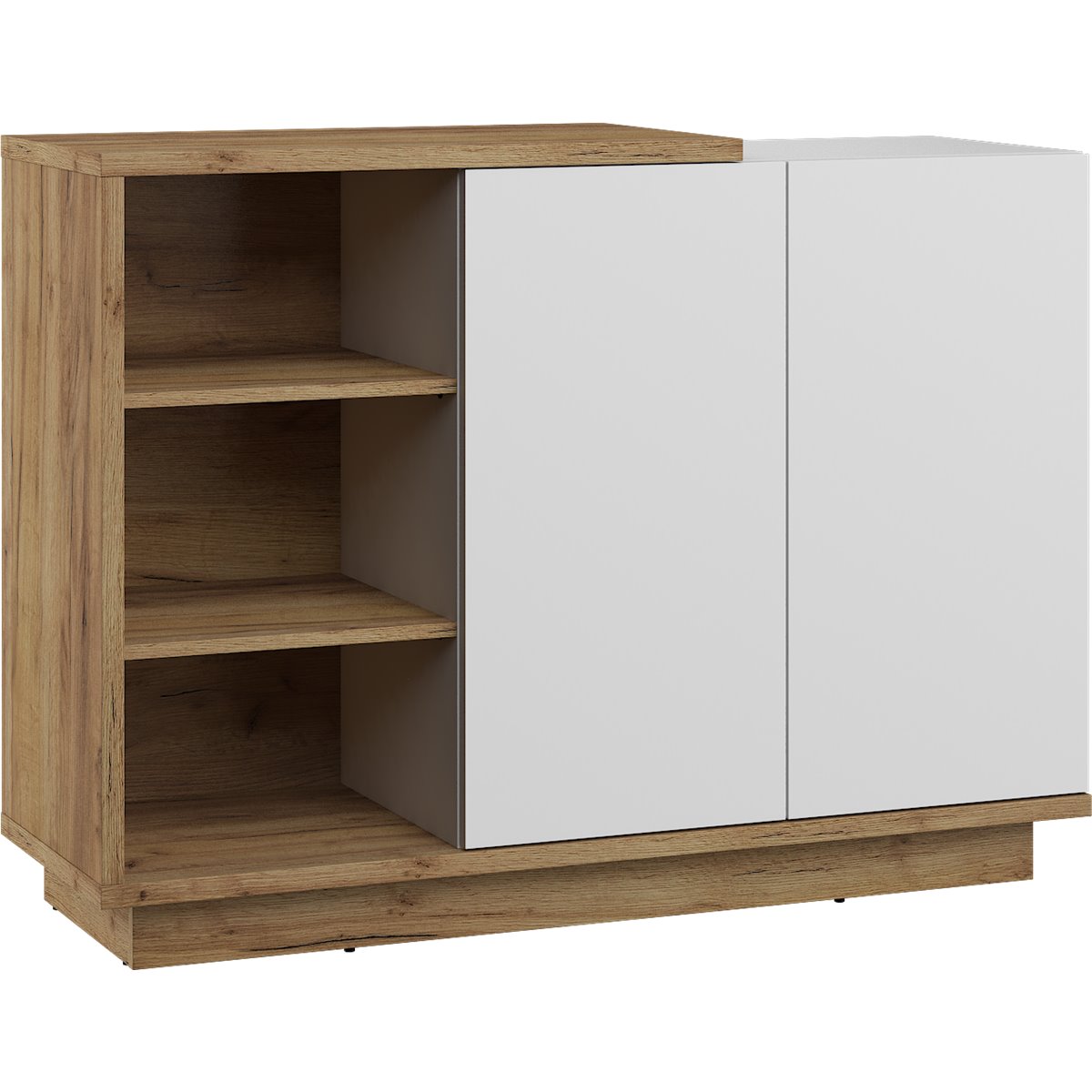 Komoda HYBRID wyposażona została w 2-drzwiowy front, za którym kryją się praktyczne półki. Drzwi w standardzie wyposażone zostały w system otwierania "push to open" co eliminuje typowe uchwyty, a naciśnięcie na front sprawia że płynnie się otwierają.