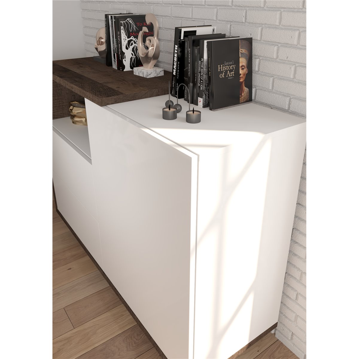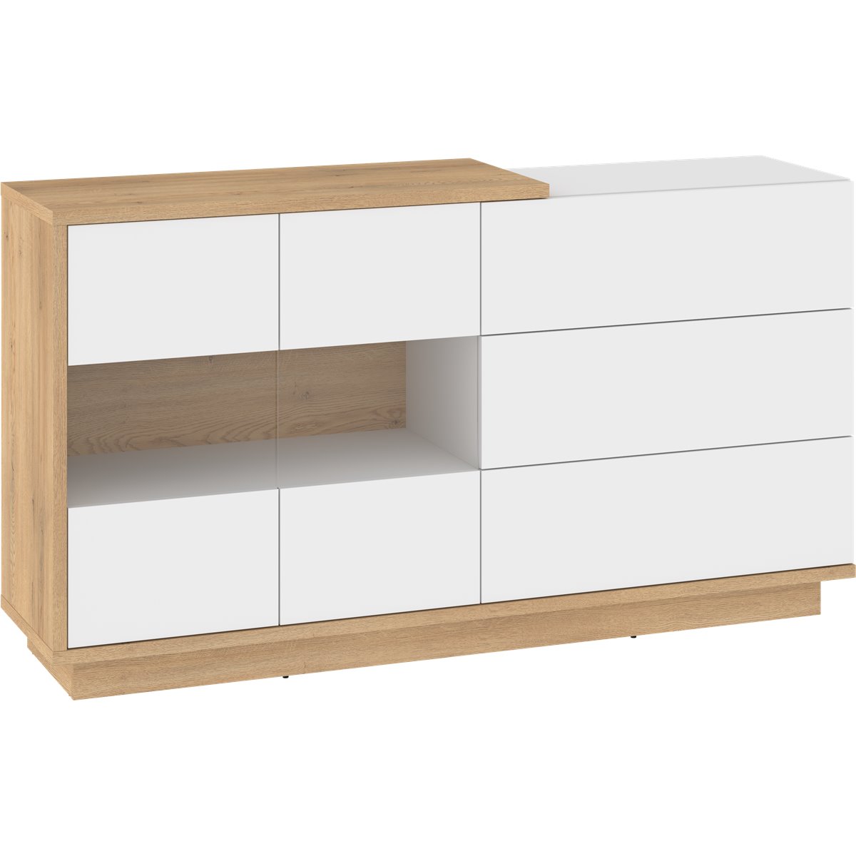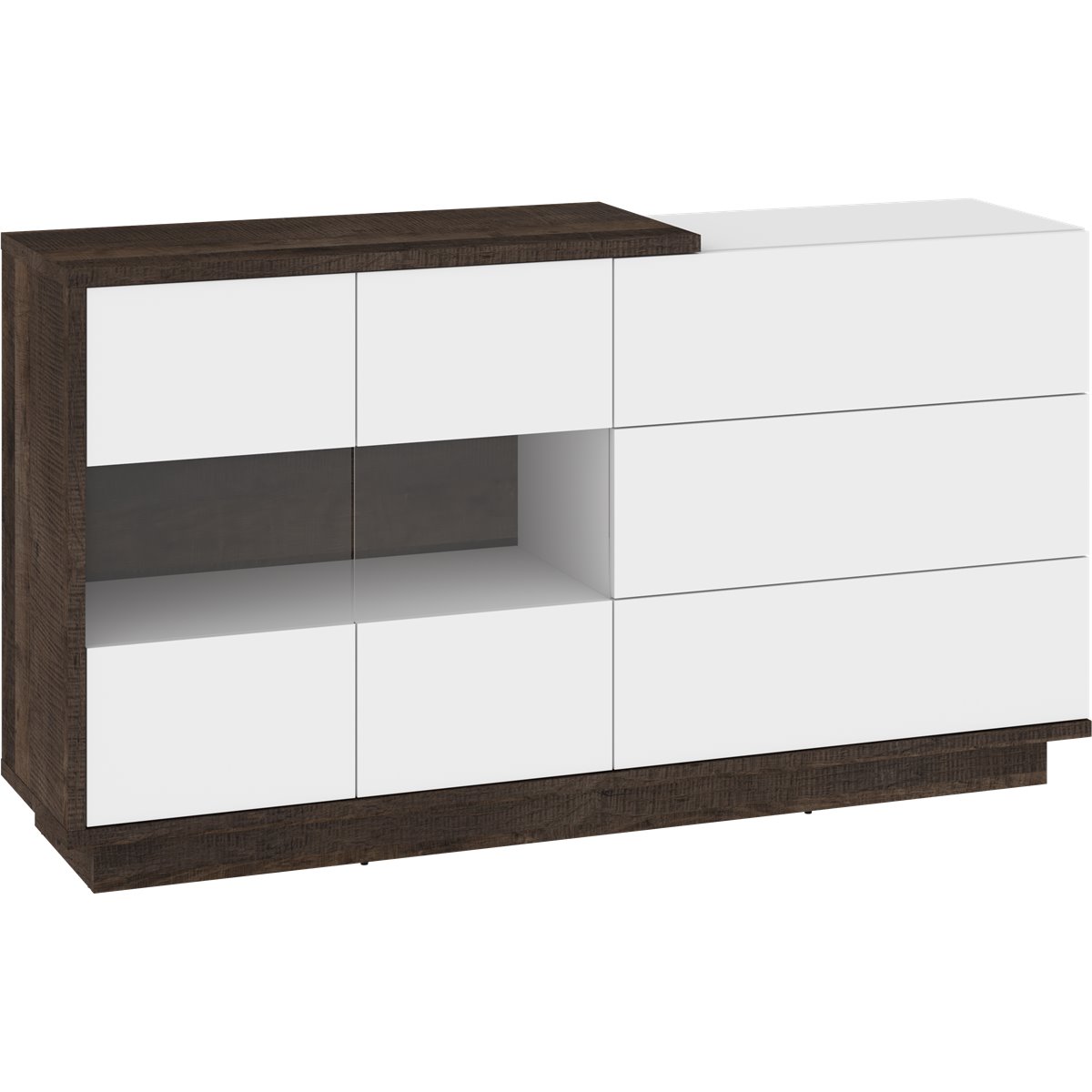 Komoda HYBRID wyposażona została w 2-drzwiowy, częściowo przeszklony front, za którym kryją się praktyczne półki oraz 3 szuflady. Drzwi i szuflady w standardzie wyposażone zostały w system otwierania "push to open" co eliminuje typowe uchwyty, a naciśnięcie na front sprawia że płynnie się otwierają.