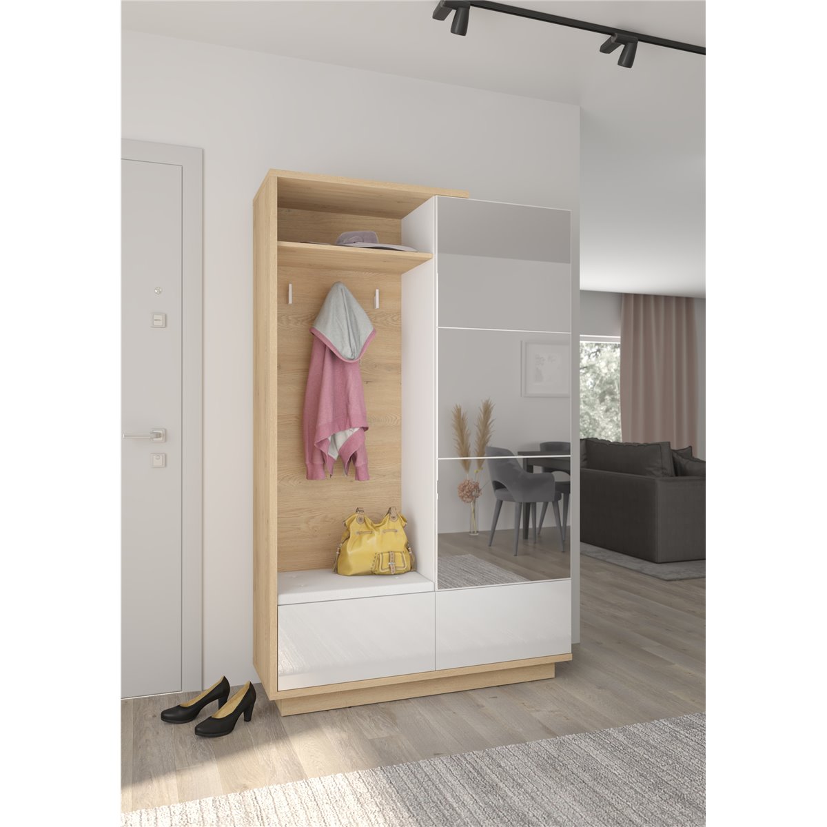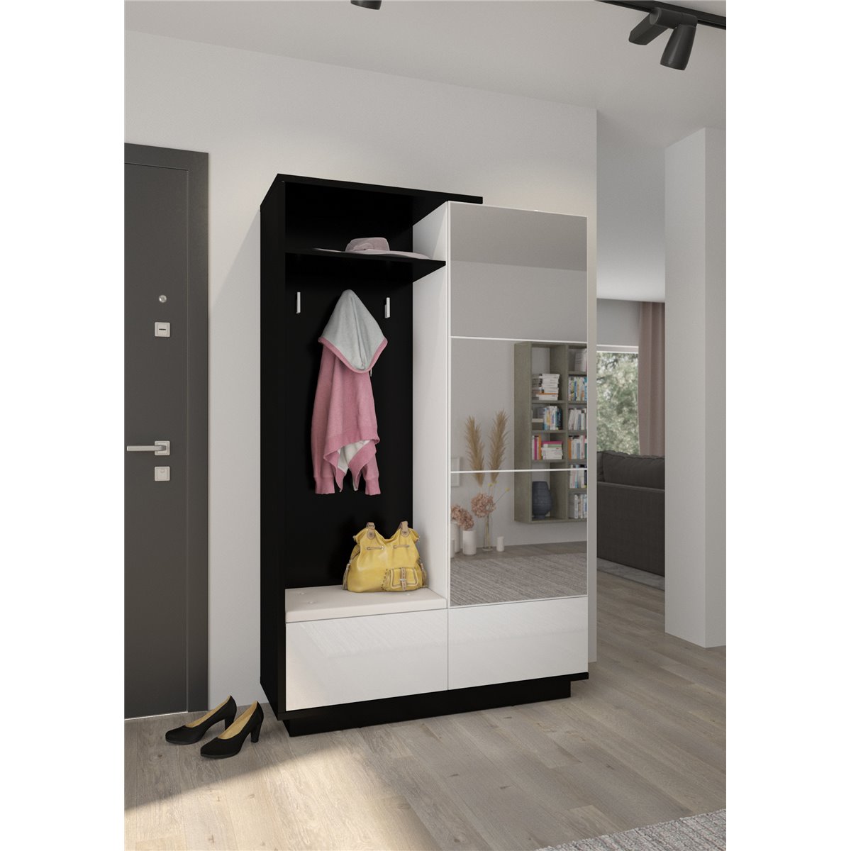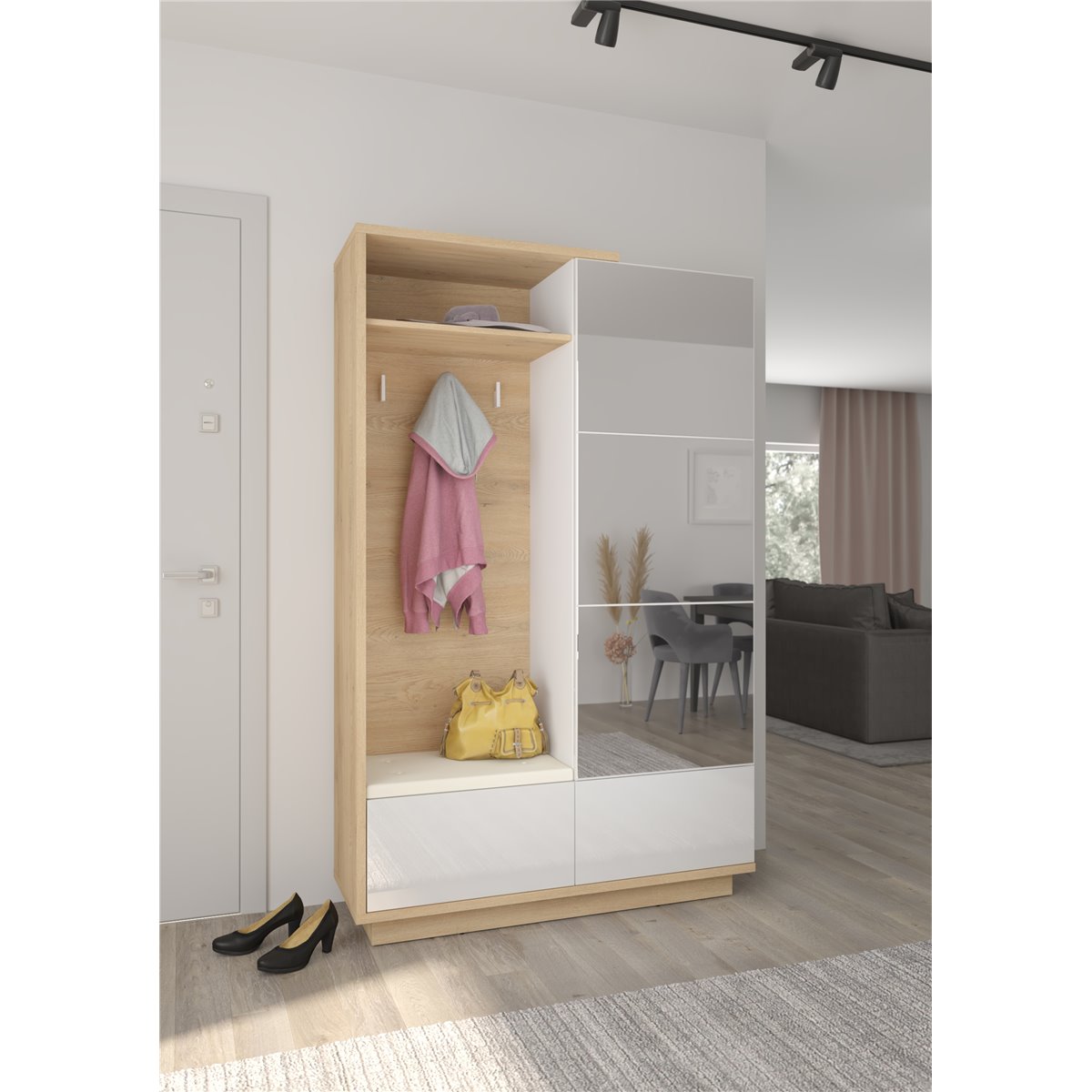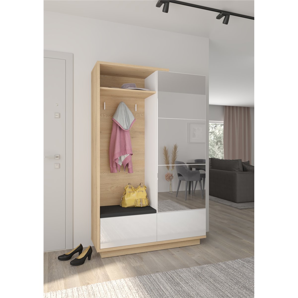 Przedpokój HYBRID wyposażony został w 1-drzwiowy front z lustrem, za którym kryje się półka oraz drążek na wieszaki, a także w komfortowe siedzisko w kolorystyce do wyboru pod którym kryje się dodatkowa szafka. Drzwi i szuflady w standardzie wyposażone zostały w system otwierania "push to open" co eliminuje typowe uchwyty, a naciśnięcie na front sprawia że płynnie się otwierają.