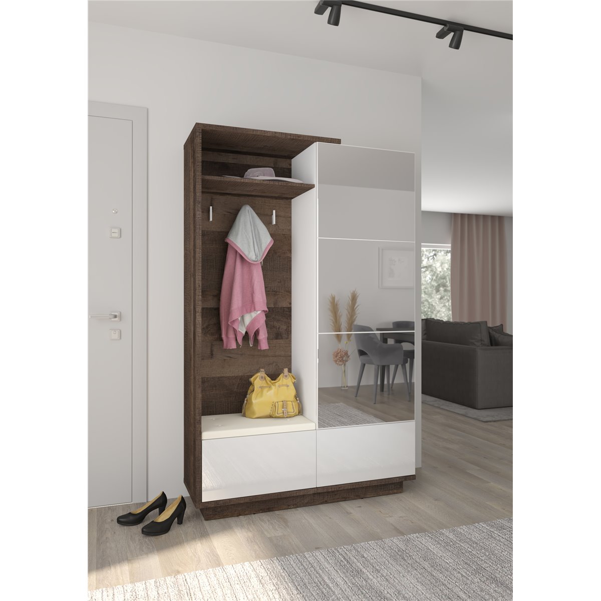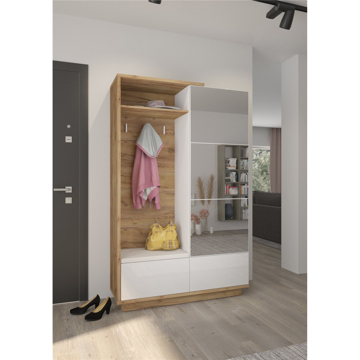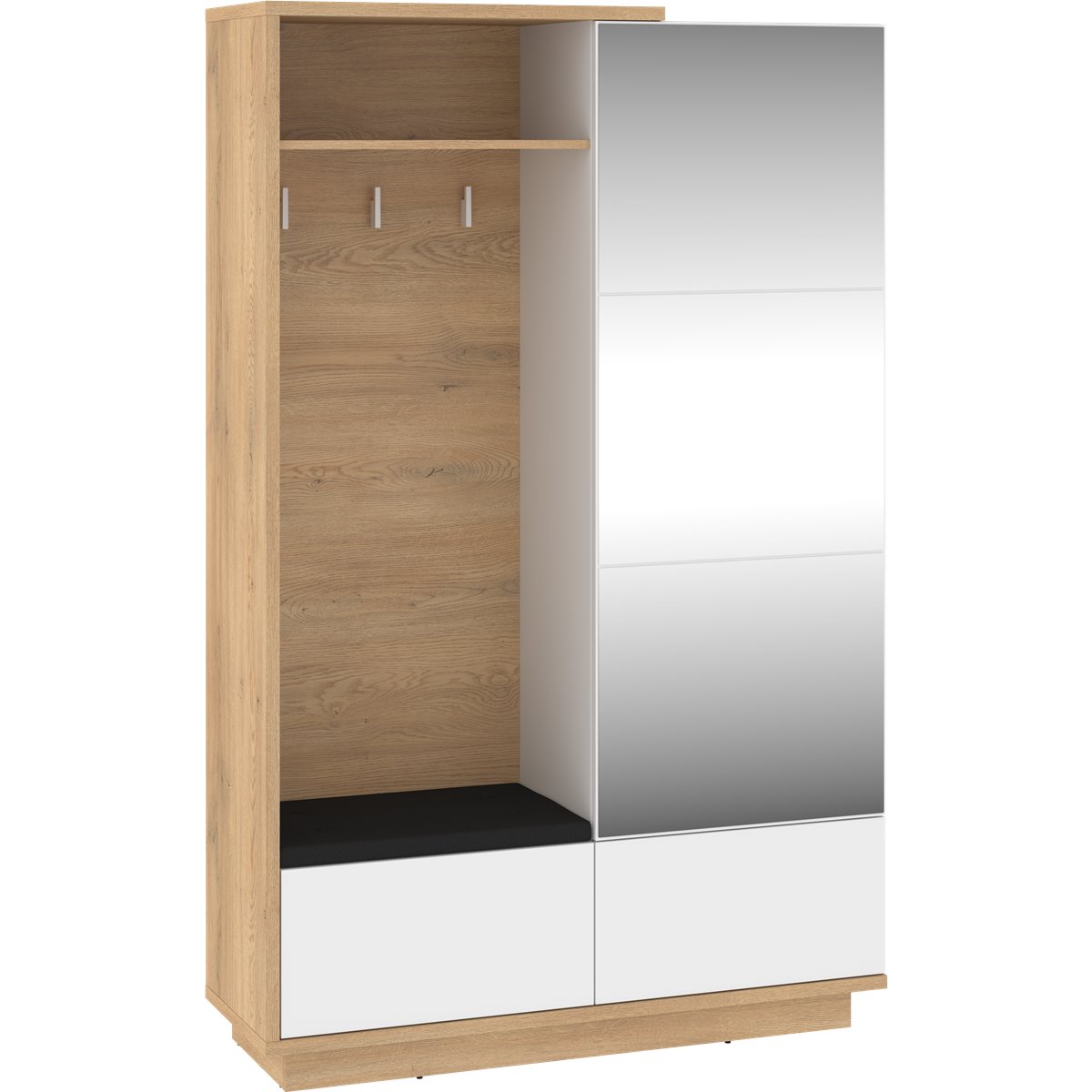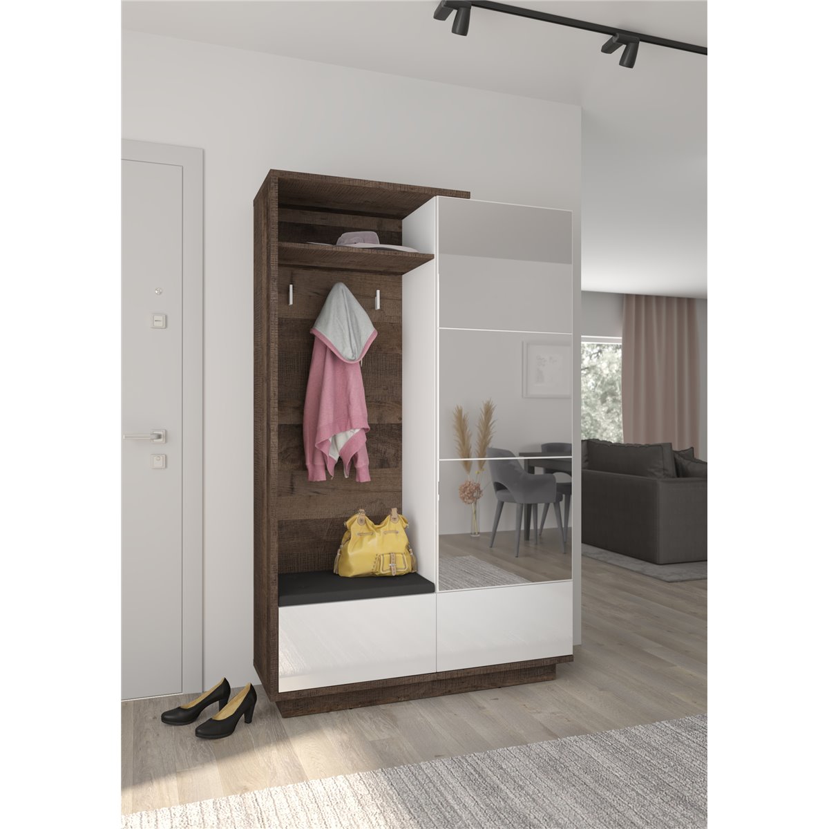 Przedpokój HYBRID wyposażony został w 1-drzwiowy front z lustrem, za którym kryje się półka oraz drążek na wieszaki, a także w komfortowe siedzisko w kolorystyce do wyboru pod którym kryje się dodatkowa szafka. Drzwi i szuflady w standardzie wyposażone zostały w system otwierania "push to open" co eliminuje typowe uchwyty, a naciśnięcie na front sprawia że płynnie się otwierają.