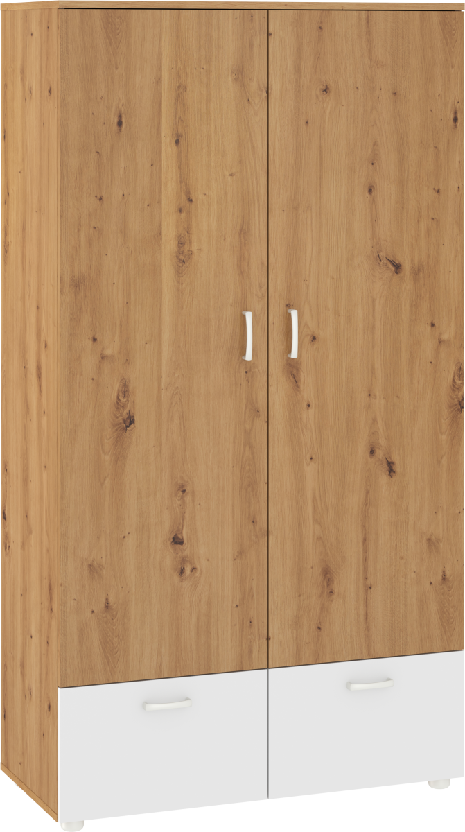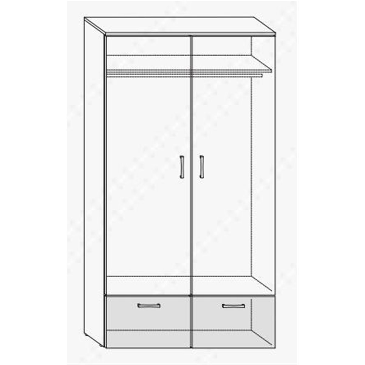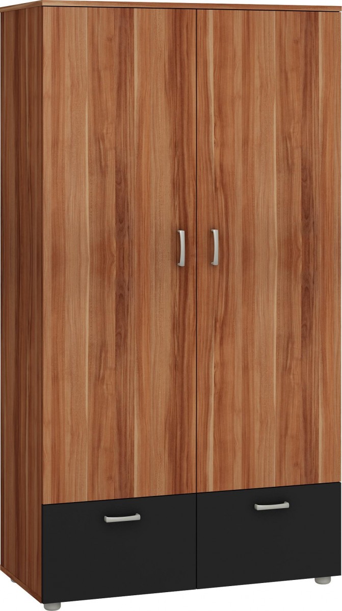 Szafa 2-drzwiowa wyposażona w 2 klapy. Wewnątrz w górnej części znajduję się półka oraz drążek na wieszaki. Uchwyty wykonane zostały z tworzywa sztucznego w kolorze satyny.