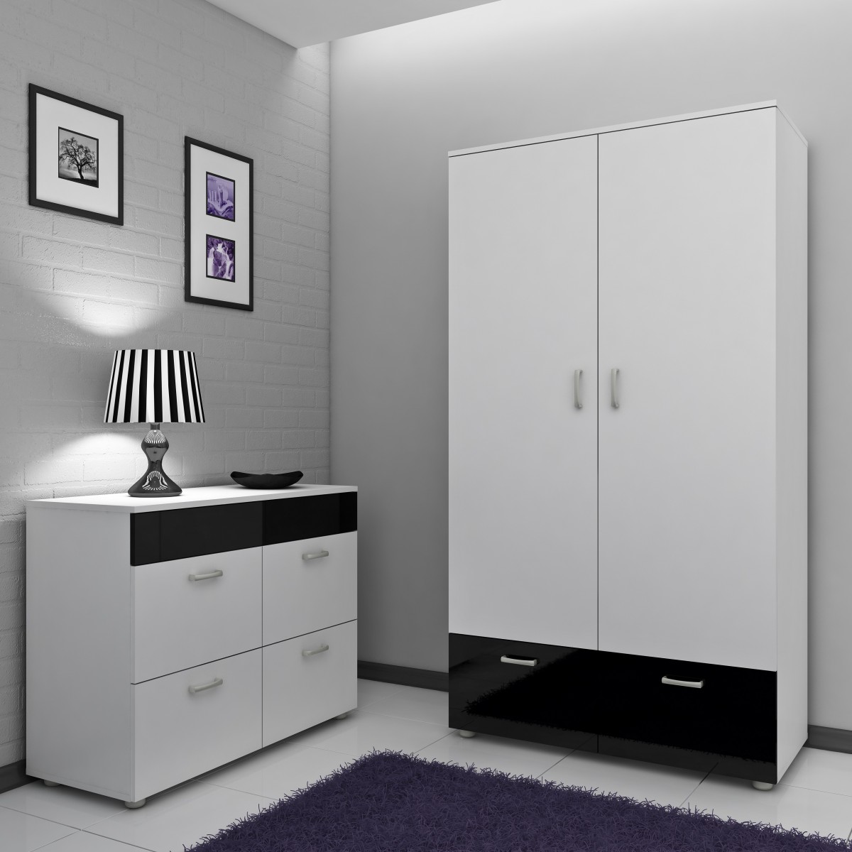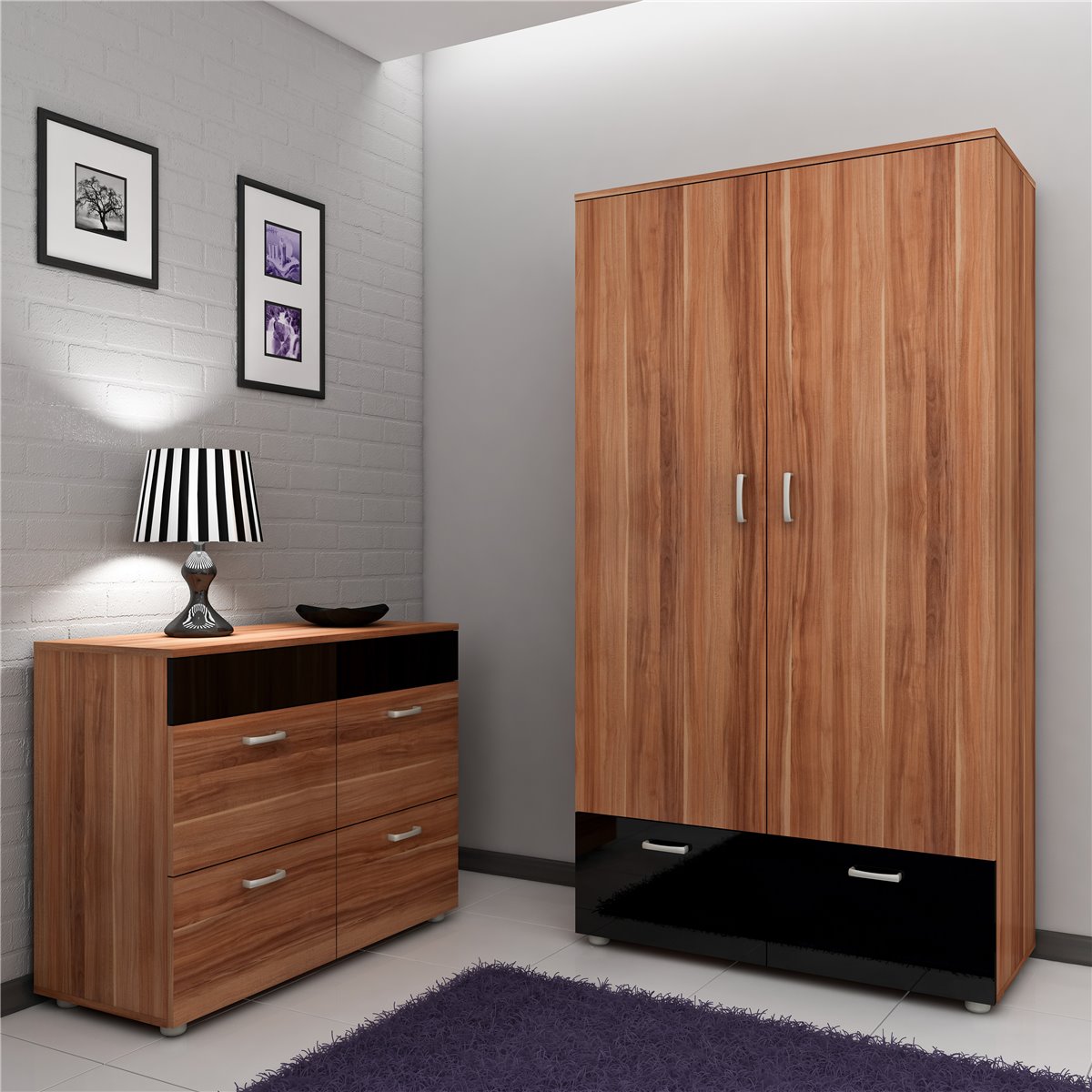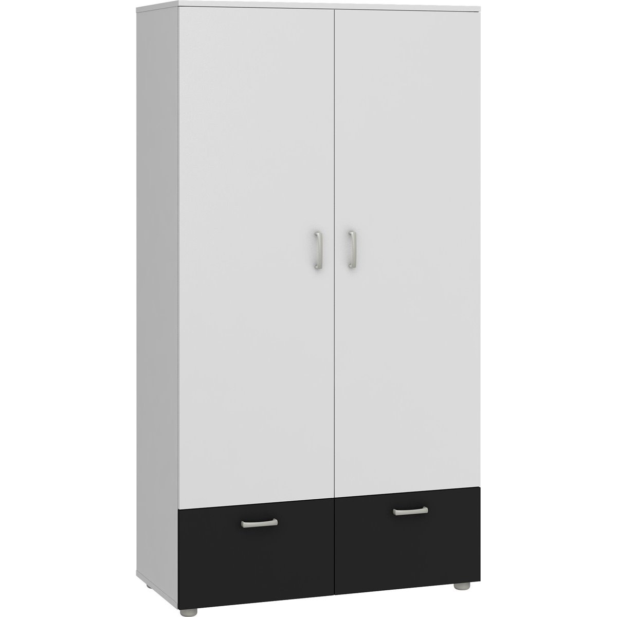 Szafa 2-drzwiowa wyposażona w 2 klapy. Wewnątrz w górnej części znajduję się półka oraz drążek na wieszaki. Uchwyty wykonane zostały z tworzywa sztucznego w kolorze satyny.