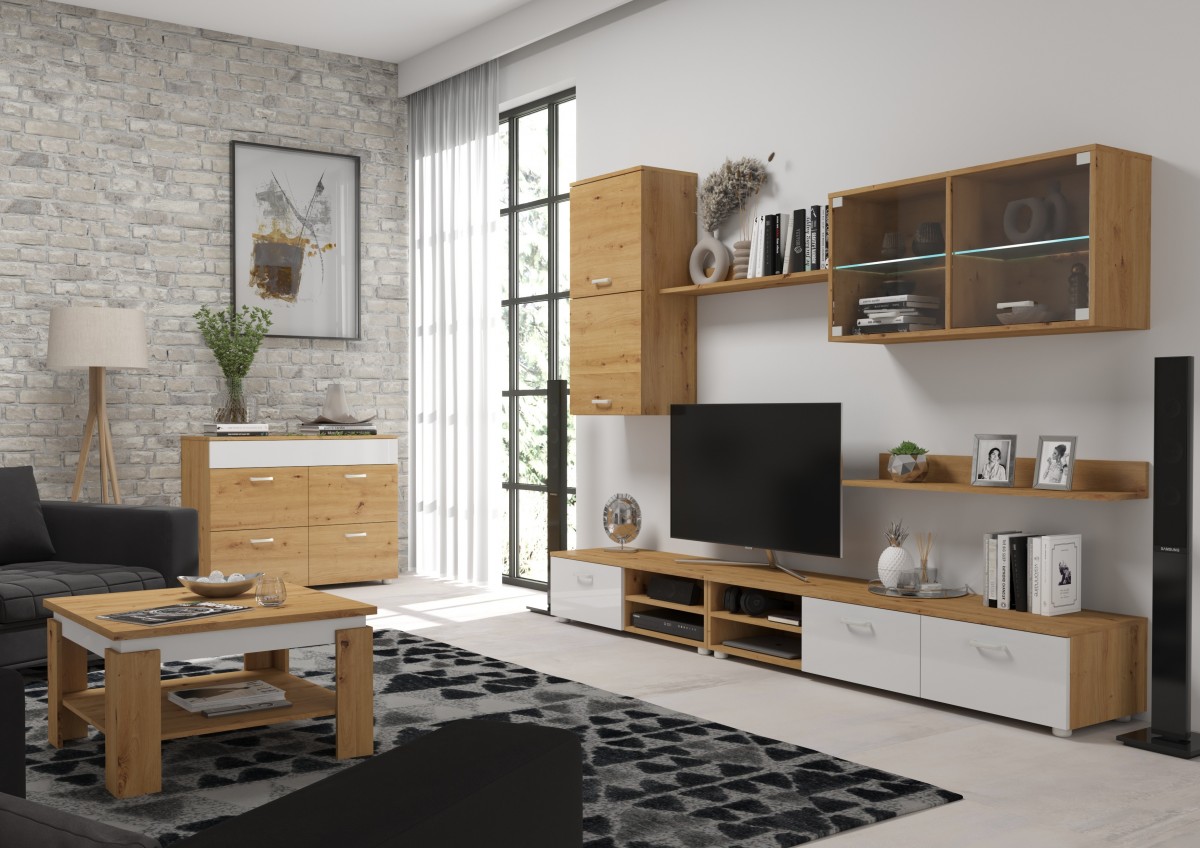 Nowoczesny zestaw mebli MAGIC to idealny pomysł do salonu lub pokoju młodzieżowego. W głównej mierze bazuje na modnych niskich szafkach, które są idealną podstawa do stworzenia centrum multimedialnego, w którym pomieścimy wszystkie sprzęty. Nowoczesny charakter podkreślają ciemne fronty o wysokim połysku i stylowe uchwyty. W systemie znaleźć można również półki, witryny, szafki wiszące i komody, które pozwolą stworzyć wymarzony zestaw do pokoju. MAGIC to propozycja kultowych mebli dostępnych w ciekawej kolorystyce.