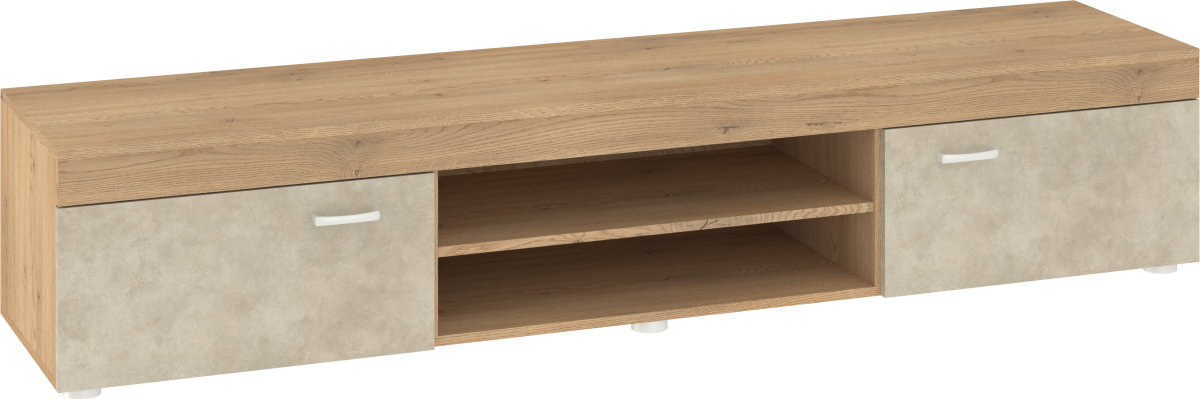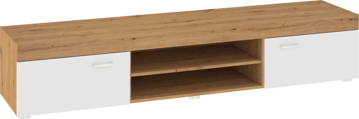 Stolik RTV MAMBA wyposażony został w 2-drzwiowy front. Pod blatem znajduję się półka, którą możesz wykorzystać na dowolne przedmioty. Uchwyty wykonane zostały z tworzywa sztucznego w kolorze satyny.