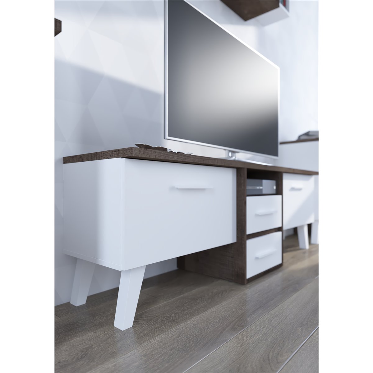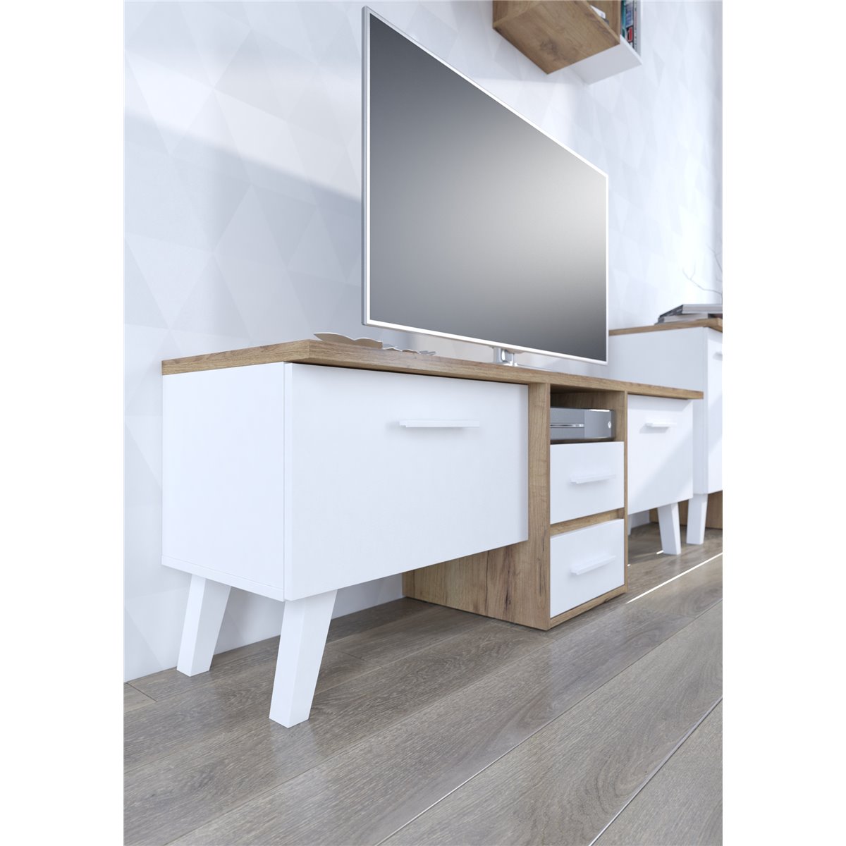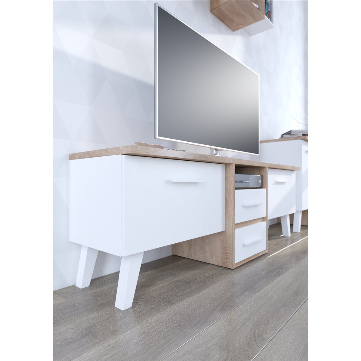 Stolik RTV NORDIS składa się z 2-drzwiowego frontu za którym kryją się praktyczne półki oraz z 2 szuflad. Ciekawym wizualnie elementem są wysokie, białe nóżki. Drzwi i szuflady w standardzie posiadają cichy domyk co sprawia, że zamykają się płynnie. Dzięki szerokiej gamie kolorów do wyboru na pewno wybierzesz coś dla siebie.