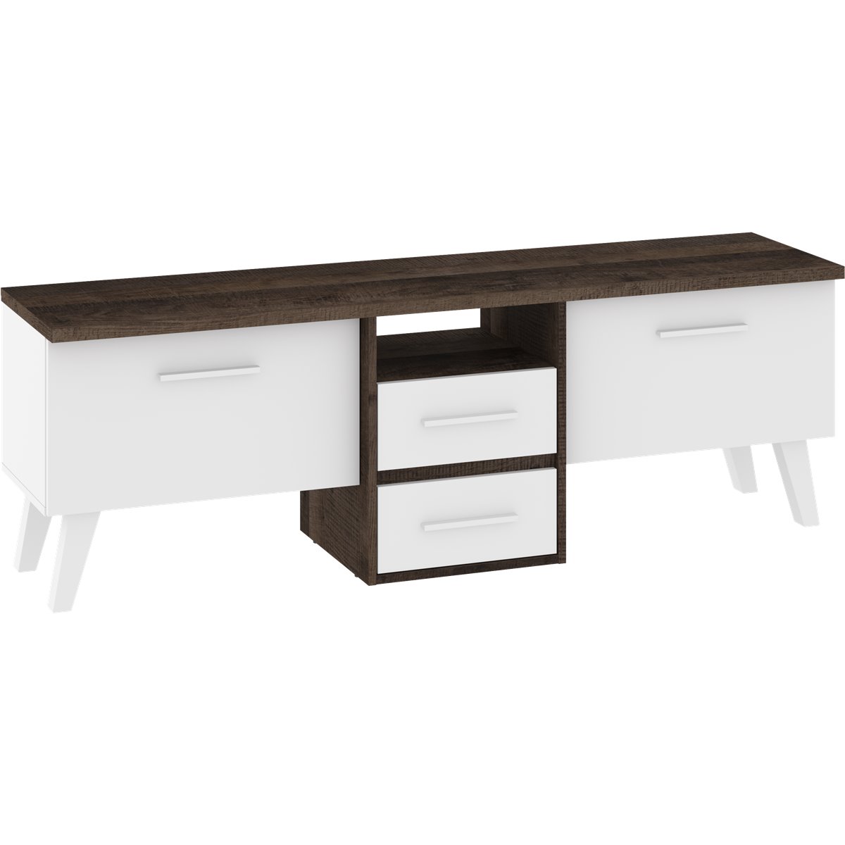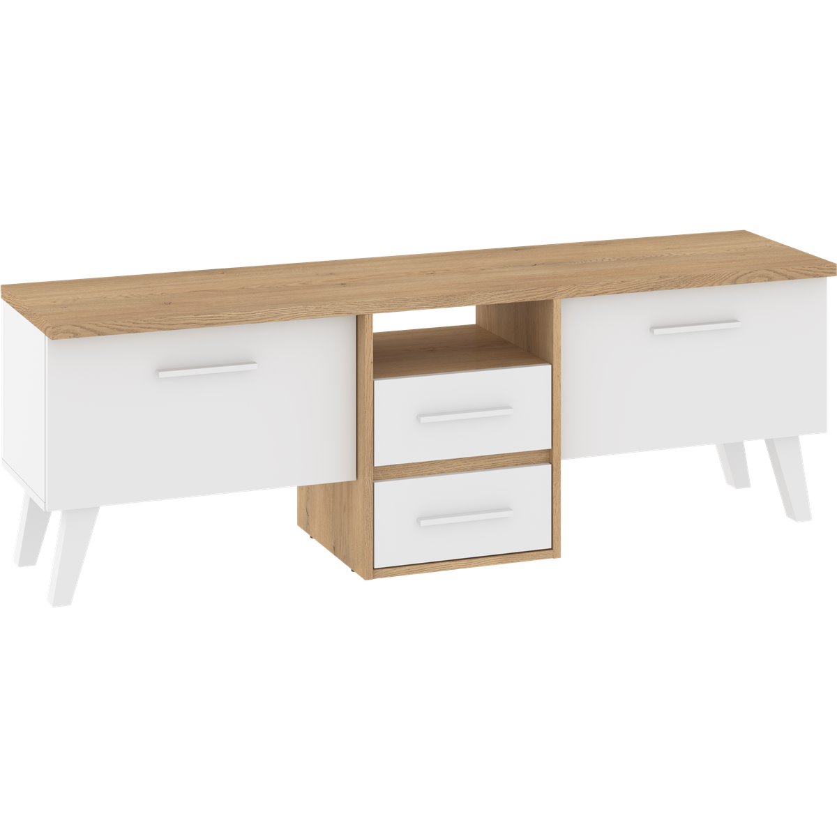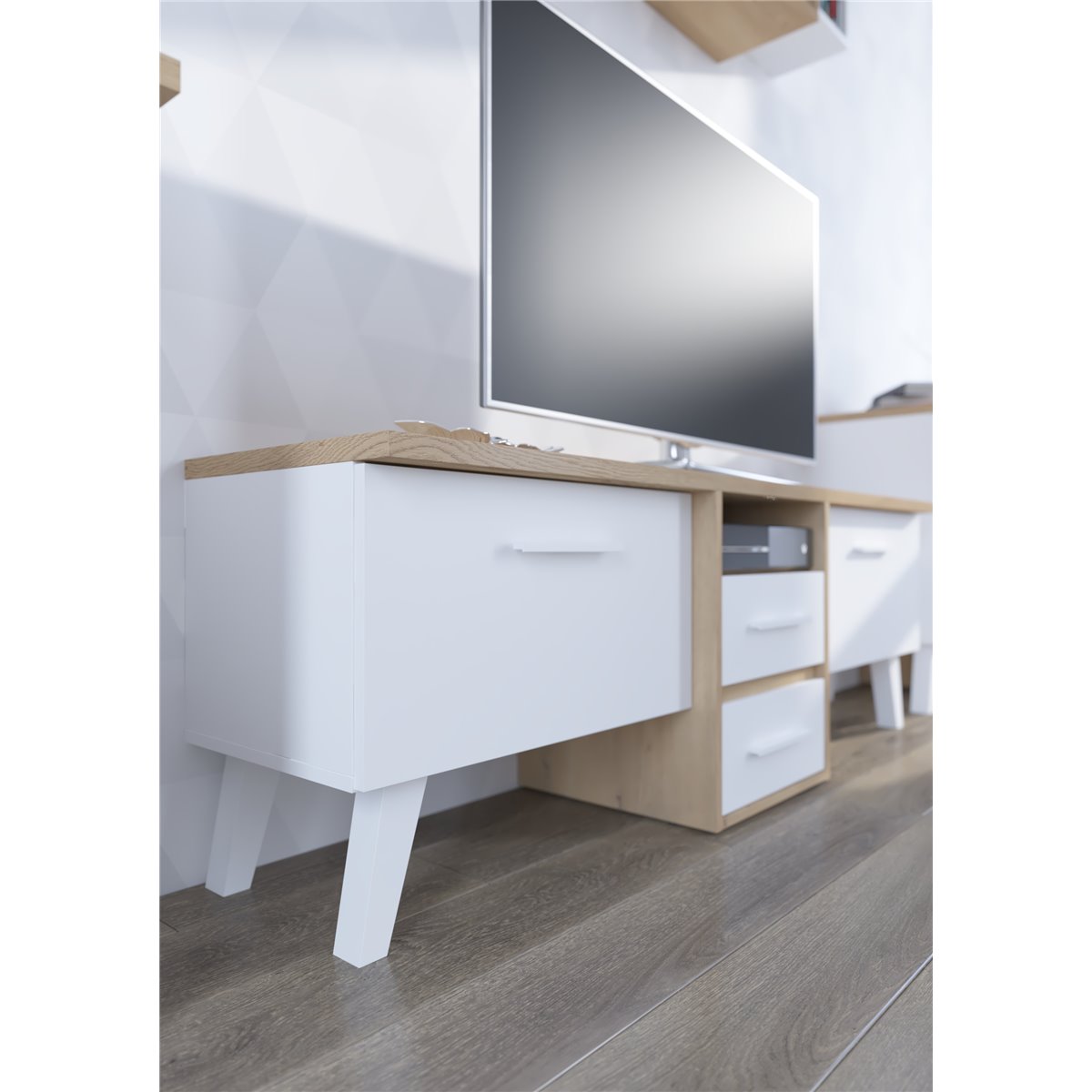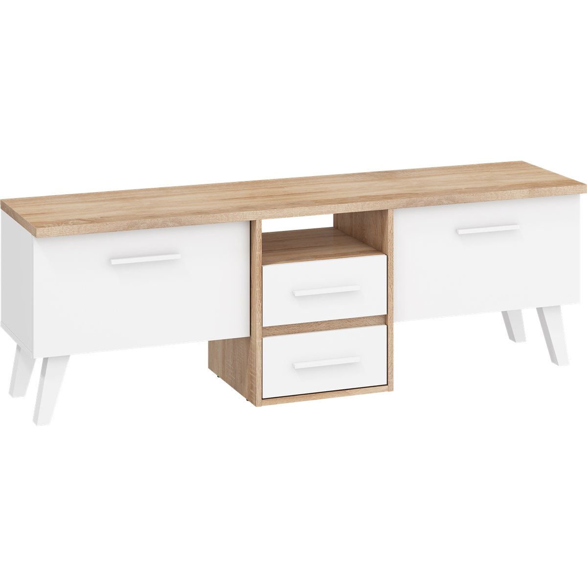 Stolik RTV NORDIS składa się z 2-drzwiowego frontu za którym kryją się praktyczne półki oraz z 2 szuflad. Ciekawym wizualnie elementem są wysokie, białe nóżki. Drzwi i szuflady w standardzie posiadają cichy domyk co sprawia, że zamykają się płynnie. Dzięki szerokiej gamie kolorów do wyboru na pewno wybierzesz coś dla siebie.
